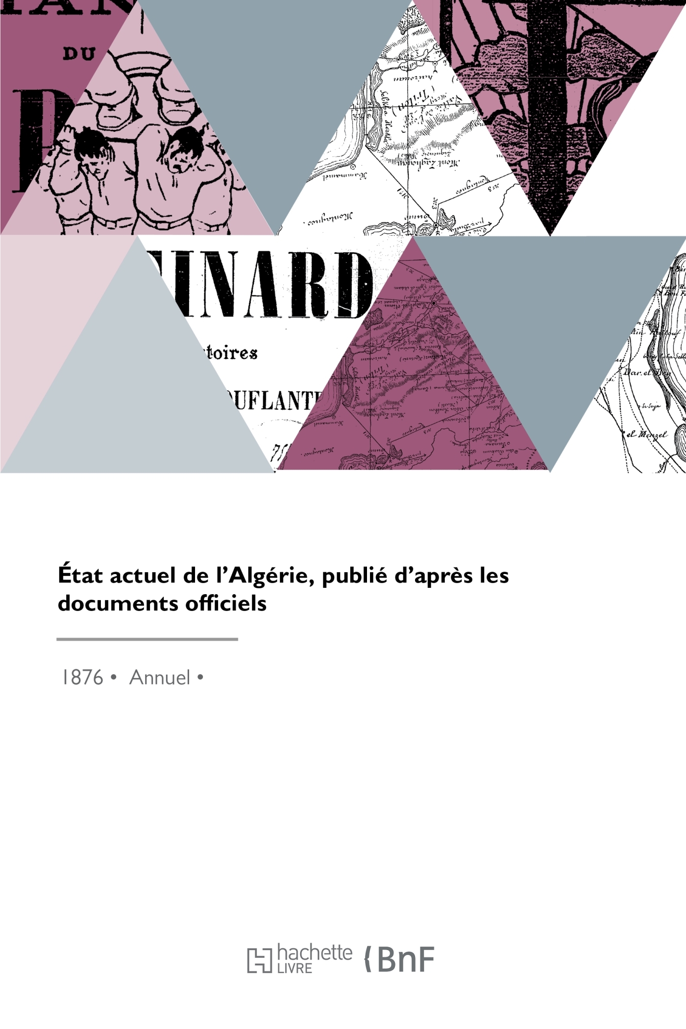 État actuel de l'Algérie : publié d'après les documents officiels... Date de l'édition originale : 1876 La présente revue s'inscrit dans une politique de conservation patrimoniale de la presse française mise en place avec la BnF. Hachette Livre et la BnF proposent ainsi un catalogue de titres indisponibles, la BnF ayant numérisé ces publications et Hachette Livre les imprimant à la demande. Certains de ces titres reflètent des courants de pensée caractéristiques de leur époque, mais qui seraient aujourd'hui jugés condamnables. Ils n'en appartiennent pas moins à l'histoire des idées en France et sont susceptibles de présenter un intérêt scientifique ou historique. Le sens de notre démarche éditoriale consiste ainsi à permettre l'accès à ces revues sans pour autant que nous en cautionnions en aucune façon le contenu. Pour plus d'informations, rendez-vous sur www.hachettebnf.fr