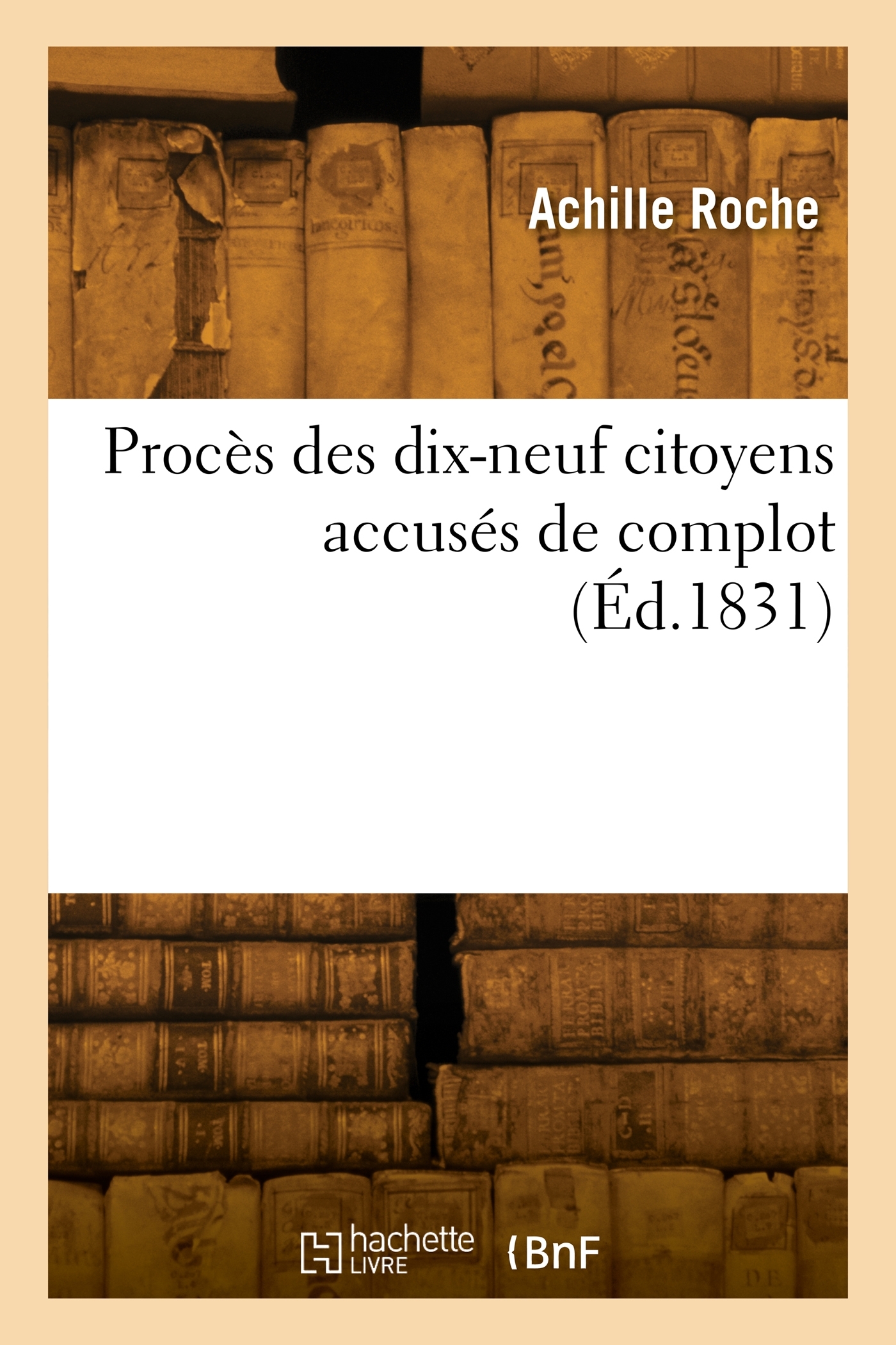 Procès des dix-neuf citoyens accusés de complot tendant à remplacer le gouvernement royal par la République, contenant leurs défenses et celles de leurs avocats Date de l'édition originale : 1831 Le présent ouvrage s'inscrit dans une politique de conservation patrimoniale des ouvrages de la littérature Française mise en place avec la BNF. HACHETTE LIVRE et la BNF proposent ainsi un catalogue de titres indisponibles, la BNF ayant numérisé ces oeuvres et HACHETTE LIVRE les imprimant à la demande. Certains de ces ouvrages reflètent des courants de pensée caractéristiques de leur époque, mais qui seraient aujourd'hui jugés condamnables. Ils n'en appartiennent pas moins à l'histoire des idées en France et sont susceptibles de présenter un intérêt scientifique ou historique. Le sens de notre démarche éditoriale consiste ainsi à permettre l'accès à ces oeuvres sans pour autant que nous en cautionnions en aucune façon le contenu. Pour plus d'informations, rendez-vous sur www.hachettebnf.fr