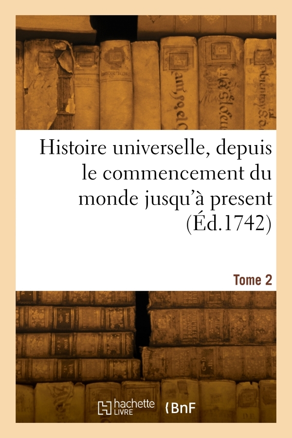 Histoire universelle depuis le commencement du Monde, jusqu'à present. Tome 2 / . Traduite de l'Anglois d'une Société de gens de lettres... Date de l'édition originale : 1742-1802 Le présent ouvrage s'inscrit dans une politique de conservation patrimoniale des ouvrages de la littérature Française mise en place avec la BNF. HACHETTE LIVRE et la BNF proposent ainsi un catalogue de titres indisponibles, la BNF ayant numérisé ces oeuvres et HACHETTE LIVRE les imprimant à la demande. Certains de ces ouvrages reflètent des courants de pensée caractéristiques de leur époque, mais qui seraient aujourd'hui jugés condamnables. Ils n'en appartiennent pas moins à l'histoire des idées en France et sont susceptibles de présenter un intérêt scientifique ou historique. Le sens de notre démarche éditoriale consiste ainsi à permettre l'accès à ces oeuvres sans pour autant que nous en cautionnions en aucune façon le contenu. Pour plus d'informations, rendez-vous sur www.hachettebnf.fr