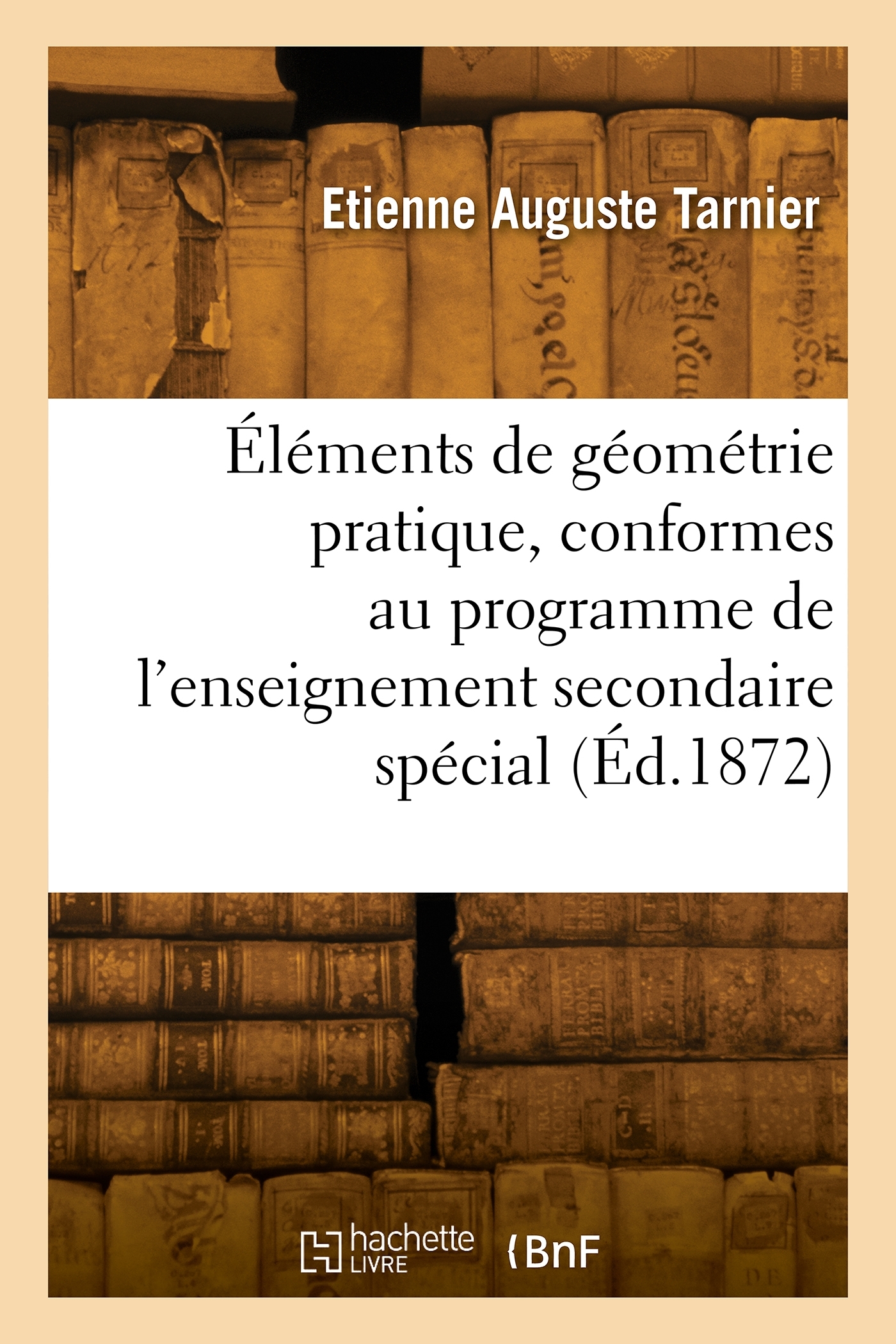 Éléments de géométrie pratique, conformes au programme de l'enseignement secondaire spécial... par E.-A. Tarnier,... Date de l'édition originale : 1872 Le présent ouvrage s'inscrit dans une politique de conservation patrimoniale des ouvrages de la littérature Française mise en place avec la BNF. HACHETTE LIVRE et la BNF proposent ainsi un catalogue de titres indisponibles, la BNF ayant numérisé ces oeuvres et HACHETTE LIVRE les imprimant à la demande. Certains de ces ouvrages reflètent des courants de pensée caractéristiques de leur époque, mais qui seraient aujourd'hui jugés condamnables. Ils n'en appartiennent pas moins à l'histoire des idées en France et sont susceptibles de présenter un intérêt scientifique ou historique. Le sens de notre démarche éditoriale consiste ainsi à permettre l'accès à ces oeuvres sans pour autant que nous en cautionnions en aucune façon le contenu. Pour plus d'informations, rendez-vous sur www.hachettebnf.fr