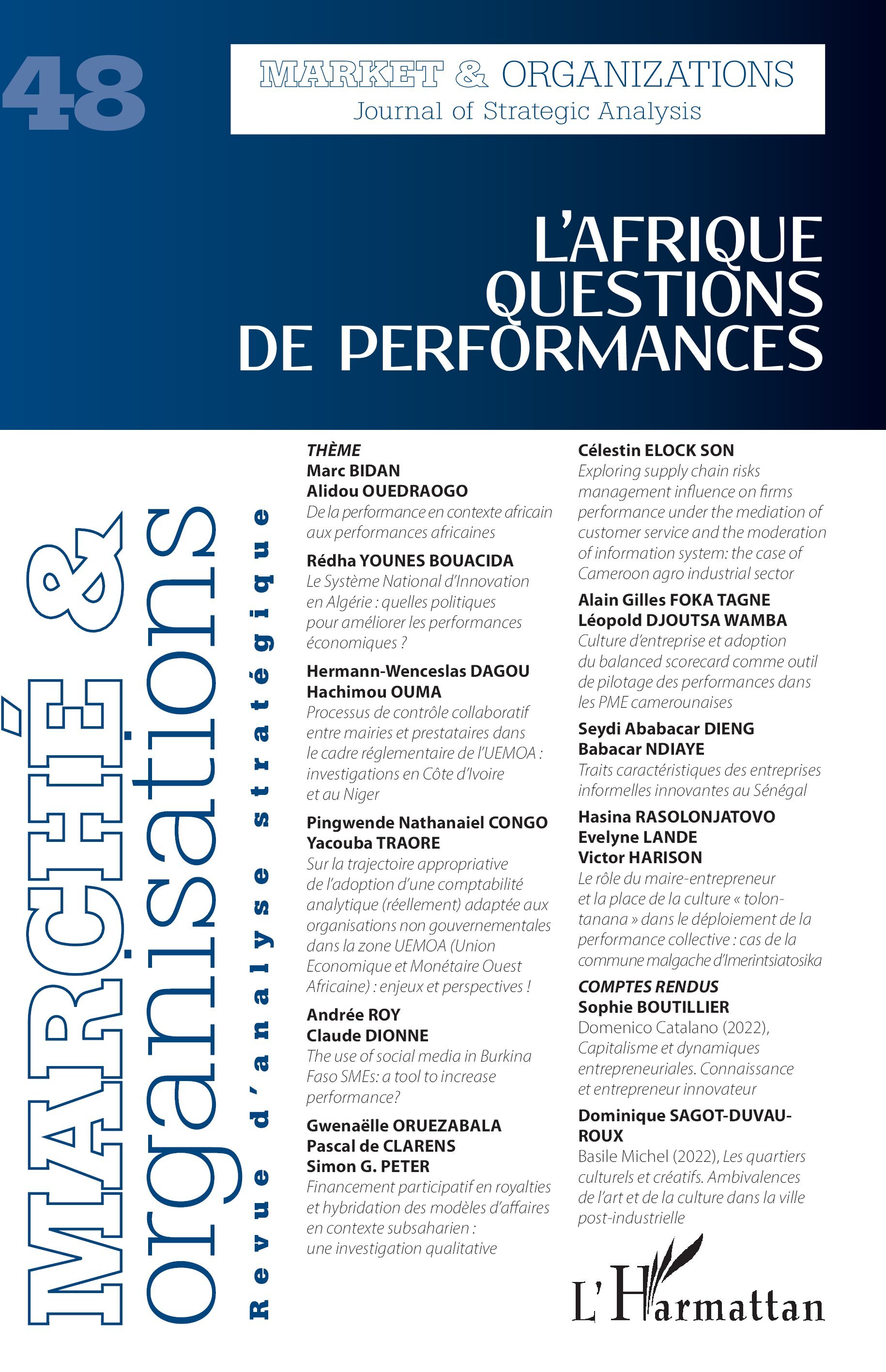 La caractérisation de la diversité des performances — qu’elles soient financières, commerciales, technologiques, économiques, organisationnelles, ressources humaines, environnementales, etc. — mobilise des ressources, des concepts, des grilles théoriques… L’Afrique est considérée comme un laboratoire d’idées et d’investigations pionnières grâce au recours à des outils méthodologiques mixtes et à des épistémologies originales. Les territoires, les écosystèmes d’affaires et d’innovation et les différents types d’ancrage des organisations et des marchés expliquent une partie de (des) la performance(s) du continent. Ce numéro spécial de Marché et Organisations propose, au travers des articles originaux, d’identifier et de caractériser cette performance / ces performances en mobilisant principalement les deux thématiques clés, en contexte africain, que sont l’agilité et la frugalité. À la confluence des sciences de gestion et des sciences économiques, les auteurs proposent un voyage à la rencontre des performances africaines. Le concept de performance est ici utilisé dans toute sa diversité, à la fois conceptuelle et empirique tout au long de la traversée de ce vaste, multiple et fascinant continent.