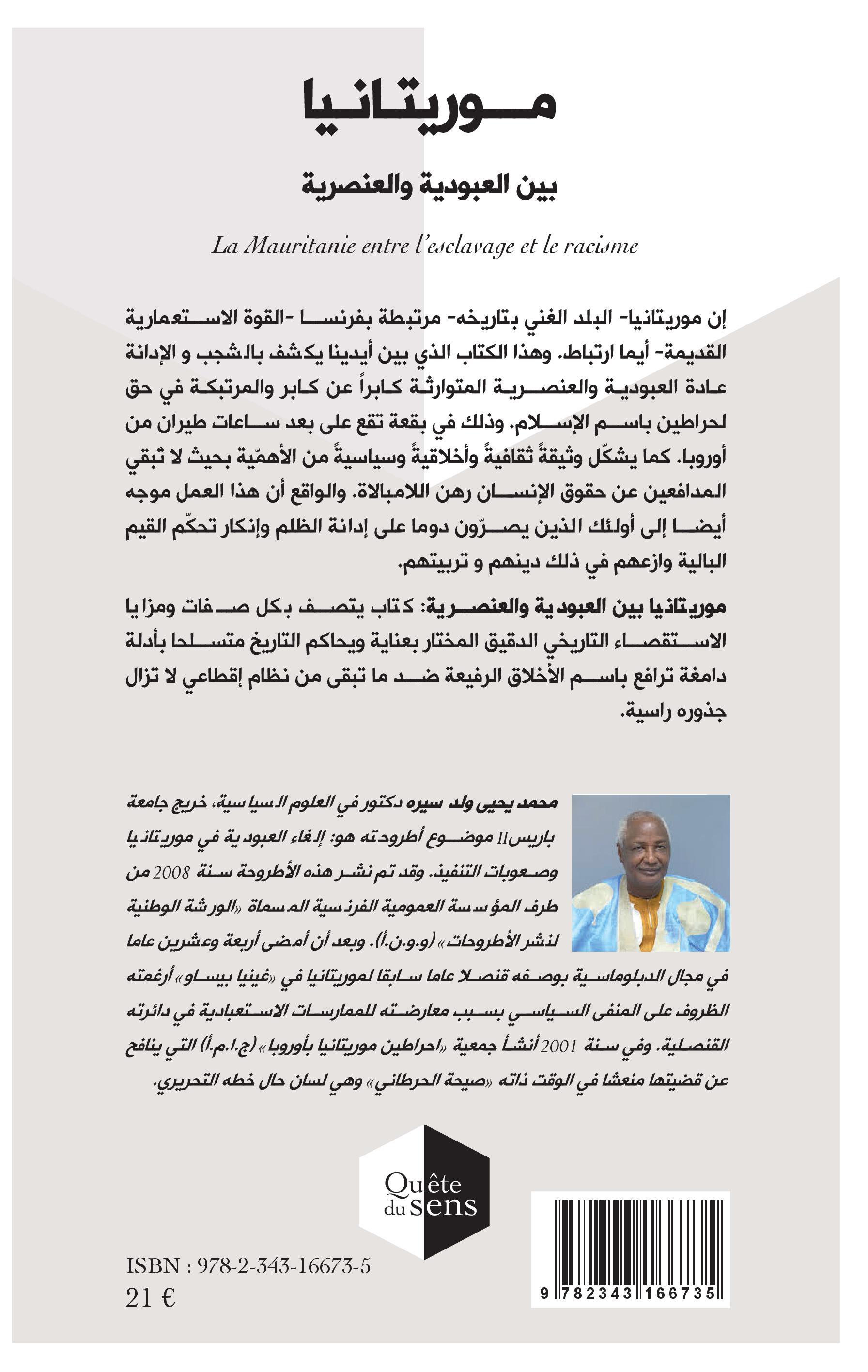 Ce livre est la traduction en arabe du livre paru en 2014. Ce livre révèle et dénonce une tradition d'esclavage et de racisme en Mauritanie, à seulement quelques heures d'avion de l'Europe, perpétuée et perpétrée, au nom de l'Islam, à l'encontre des Haratins. Il constitue un document culturel, éthique et politique qui porte toutes les qualités de l'enquête historique minutieuse et du procès à charge intenté aux survivances bien vivaces d'un système féodal.