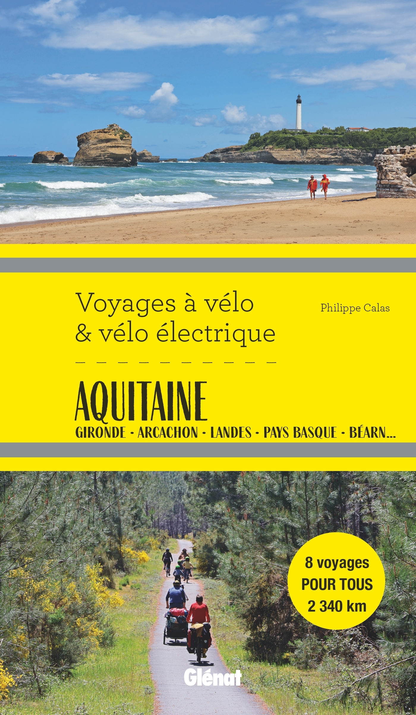 8 voyages à vélo de 2 à 8 jours pour découvrir les nombreuses richesses patrimoniales et naturelles de celle belle région. La côte Atlantique avec ses plages de sable fin et ses charmantes stations balnéaires, la forêt des Landes de Gascogne et ses agréables odeurs de pins, les chemins de halage du canal de Garonne avec ses écluses et sa voûte de platanes, les berges de l’estuaire de la Gironde avec son chapelet de carrelets, les paysages incroyables du Béarn et du Pays basque… vous attendent tout au long de vos parcours ! Vous y découvrirez des paysages très variés, un riche patrimoine historique et architectural et aussi une gastronomie réputée dans le monde entier. S’appuyant sur le réseau très développé de voies vertes – Vélodyssée ® , Scandibérique, Vélosud ou la véloroute du Canal des Deux Mers – et en complétant par de petites routes soigneusement sélectionnées, Philippe Calas a concocté des parcours sur mesure agréables et sécurisés, compatibles avec la pratique du voyage à vélo, en boucles ou en aller simple avec retour en train, et modulables à souhait. Il y en a pour tous et pour tous les goûts ! Les étapes courtes, de l’ordre de 50 à 60 km, soit 4 heures de vélo en mode balade, laisseront le temps aux visites et aux activités en chemin ou à l’étape. Pour des voyages réussis : – traces GPS téléchargeables – topos détaillés – cartes – hébergements – réparateurs/loueurs de vélos Le tout richement illustré et agrémenté d’informations sur les localités et les sites traversés. Les voyages : 1. Entre Garonne, Gironde et Océan Bordeaux – Blaye – Royan – Lacanau – Arcachon – Bordeaux 434 km • 7 à 8 jours 1.1 Moitié nord Bordeaux – Blaye – Royan – Montalivet – Lacanau – Bordeaux 323 km • 5 à 6 jours 1.2 Moitié sud Bordeaux - Lacanau – Cap Ferret – Arcachon – Hostens – Bordeaux 244 km • 4 à 5 jours 1.3 Liaison Lacanau Bordeaux Lacanau – Bordeaux 64 km • 1 jour 2. De la Gironde aux Landes maritimes Arcachon – Mimizan – Hostens – Arcachon 234 km • 4 à 5 jours scindables en deux voyages 3. Des Landes terrestres à la Garonne Mont-de-Marsan – Langon – Nérac – Mont-de-Marsan 371 km • 6 à 7 jours scindables en deux voyages 4. Les Landes méridionales Mont-de-Marsan – Mimizan – Vieux-Boucau-les-Bains – Dax – Mont-de-Marsan 312 km • 5 à 6 jours scindables en deux voyages 5. Des Landes au Béarn Mont-de-Marsan – Artix – Urt – Dax – Mont-de-Marsan 366 km • 6 à 7 jours scindables en deux voyages 6. Des Landes au Pays basque Bayonne – Vieux-Boucau-les-Bains – Bayonne 123 km • 2 jours 7. En longeant les Pyrénées… du Béarn au Pays basque Pau – Saint-Jean-Pied-de-Port – Oloron-Sainte-Marie – Pau 268 km • 4 à 5 jours scindables en deux voyages 8. Grand tour du Pays Basque français Bayonne – Saint-Jean-Pied-de-Port – Saint-Palais – Bayonne 230 km • 4 à 5 jours scindables en deux voyages Les véloroutes empruntées : Vélodyssée ® (EV1) Scandibérique ® (EV3) Véloroute du Canal des deux mers Véloroute Bordeaux – Arcachon (V747) Vélosud (V81) : véloroute du Piémont Pyrénéen Routes des cols des Pyrénées Chemins de Compostelle : Voie d’Arles, Voie du Puy et Voie de Vézelay Véloroute Vieux-Boucau – Dax (V744) Véloroute Marmande Mimizan (V743)