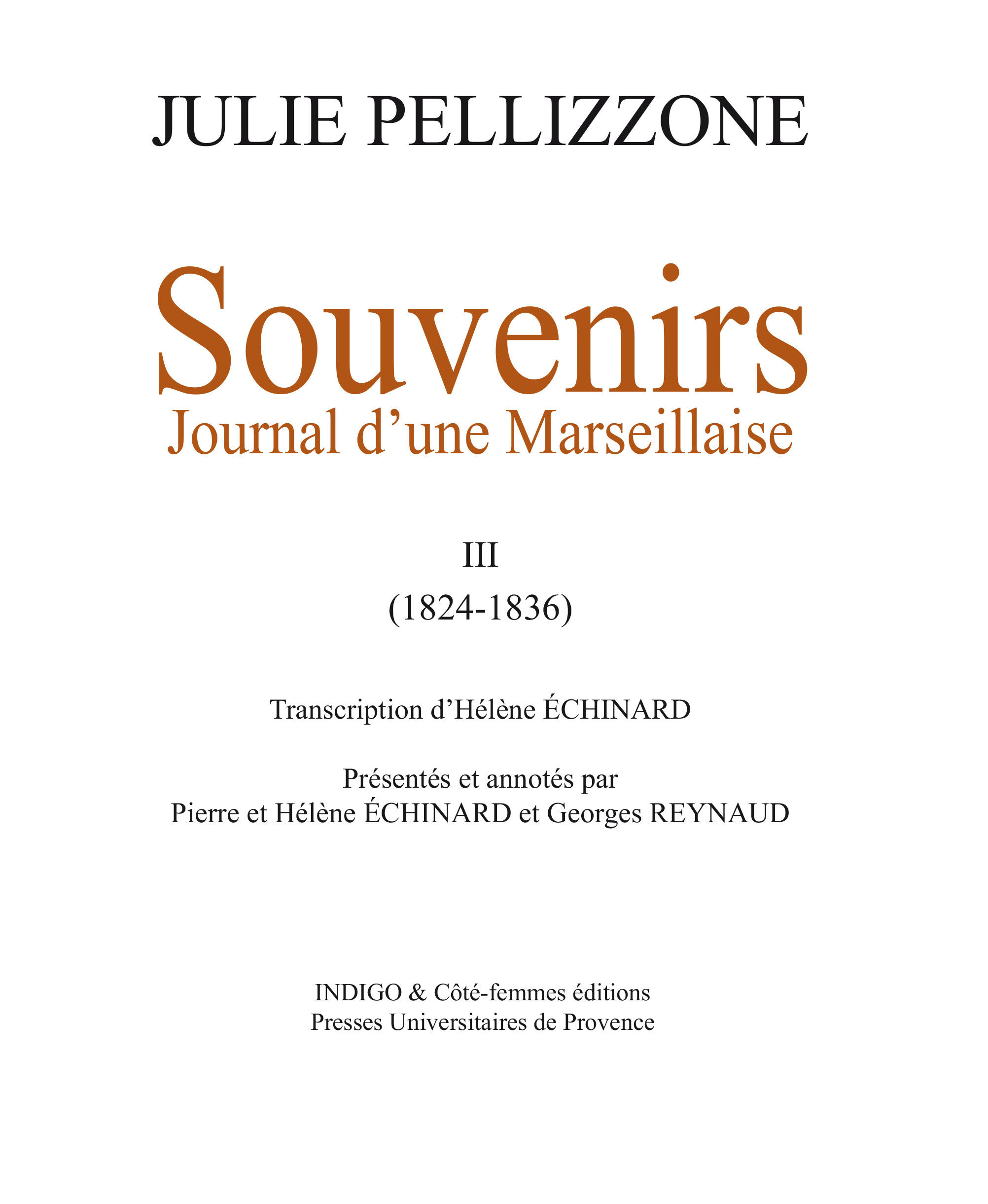 En 1811, Julie Pellizzone (1767-1837) décide de se souvenir et de témoigner. Dès lors, pendant un quart de siècle, elle consigne méticuleusement l'histoire de sa ville : Marseille. Passionnée de politique, attentive à la condition féminine, mais aussi à la vie quotidienne, aux fêtes religieuses ou profanes, aux spectacles, aux beauxarts..., Julie dépeint sous des couleurs nouvelles la vie d'une grande ville de province à l'orée du XIXe siècle. Après un premier tome (1787-1815) couronné par le Grand Prix Historique de Provence en 1996, le deuxième tome (1815-1824), qui couvre le règne de Louis XVIII, apportait sa nouvelle moisson de matériaux inédits pour l'histoire de la cité phocéenne. Ce troisième et dernier tome (1824-1836) correspond au règne interrompu de Charles X et aux premières années tumultueuses de la monarchie de Juillet. Il nous livre le témoignage et les pensées de l'auteur au soir de sa vie.