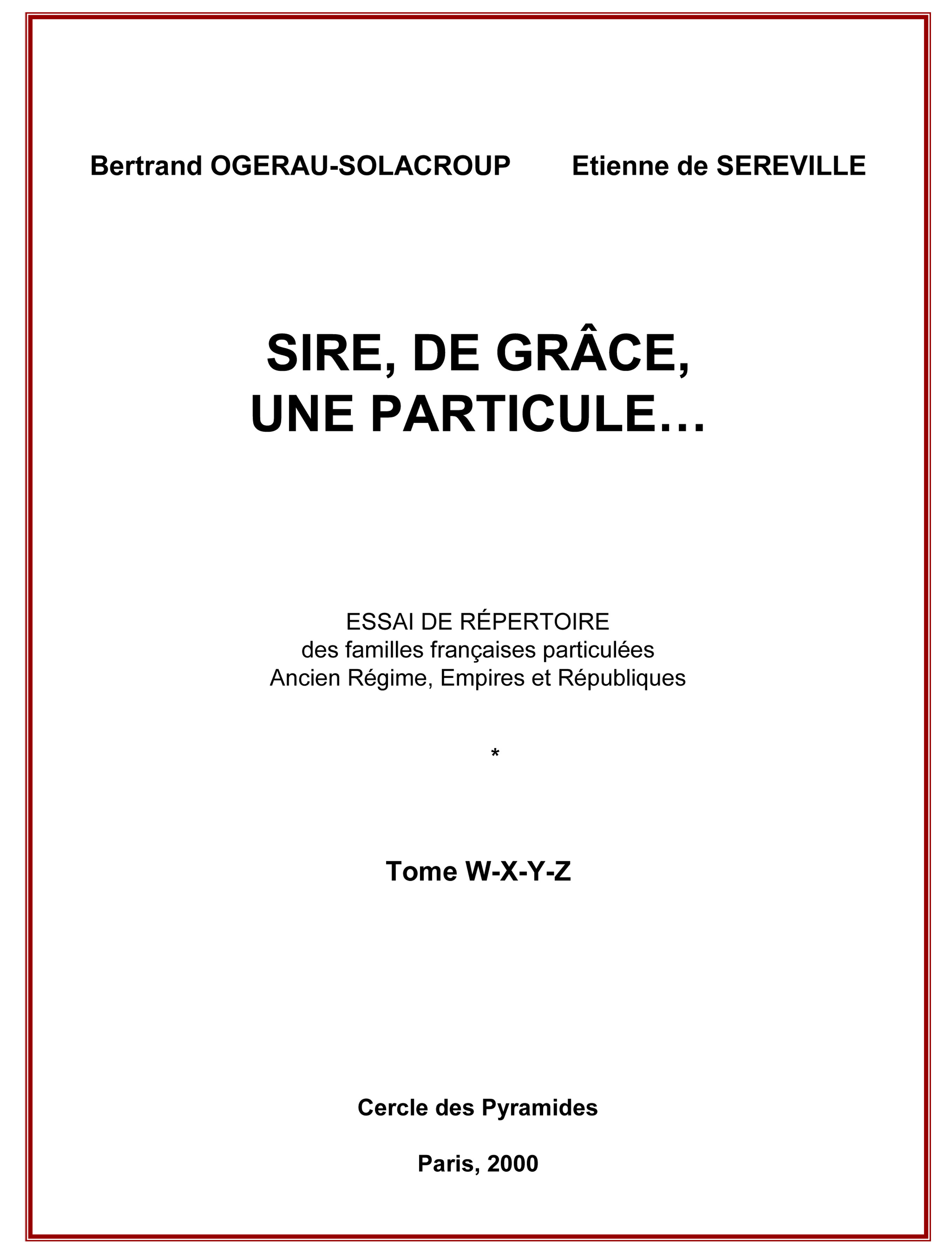 Conjointement avec Etienne Chapelain de Seréville TOME W - X - Y - Z : 482 NOTICES Exemples de notices figurant dans le Tome W - X - Y - Z : TOME W : 311 NOTICES Premier nom : WAAL (de) Dernier nom : WYREWA (de) WACHE de CORBIE, olim WACHE: Décret du 9 juillet 1968 autorisant la reprise du nom maternel pour Jean-Louis Waché, époux d’Odile de CORBIE et leurs enfants (famille de Savoie d’extraction et subsistante). Alliances : REMBRY (1980), Corbie (de). WALSH (variante WAILSH) de SERRANT, de WALSH SERRANT : Irlande, France (Saint Malo, Nantes) naturalisée en 1660, confirmée noble en 1754, Conseiller secrétaire du Roi le 21 juin 1750, Honneurs de la cour. Comte de l’Empire le 2 septembre 1810. Une branche sans particule, mais titrée, subsista jusqu’après 1883 avec le comte WLASH, frère d’Olivier Edmond Vicomte WALSH, chambellan de Napoléon III, mort rue Saint Florentin à Paris le 9 avril 1883. TOME X : 11 NOTICES Premier nom : XAINTRAILLES (de) Dernier nom : XIVRY (de) XÉRICA (de) : Espagne. France (Première moitié du XIXe siècle). Bourgeoisie. XIMENEZ (de) : Espagne. Famille habituée en France, au XXe siècle. Alliance : HAMEL du BREUIL de BAZAIS (du), en 1926. TOME Y : 67 NOTICES Premier nom : YAECHE (de ALBUQUERQUE) Dernier nom : YZARNY GARGAS (d’) YRIGOYEN (de) : Pays Basque espagnol. Une chanoinesse comtesse de Munich au début du XXème siècle (mais les preuves pour les familles françaises sont-elles crédibles en Allemagne ?) et on peut légitimement se poser la question de savoir qui est le « juge d’armes », dans ce cas de figure, en dehors de toute juridiction française. Alliances : SIOCHAN de KERSABIES (1989), CHEGUILLAUME, DESNOS (1997). YVERSEN (d’), YVERSEN d’AUSSENDAL (d’) : Languedoc, Rouergue. Cette famille comparut, à Toulouse, en 1789. Baron d’Empire le 2 janvier 1814, baron héréditaire sur institution de majorat le 15 novembre 1817 titre éteint le 30 avril 1904. TOME Z : 93 NOTICES Premier nom : ZABAL (de) Dernier nom : ZYLOF (de), ZYLOF de STEENBOURG, ZYLOF de WYNDE ZELLINGER de BALKANY, olim ZELLINGER : Hongrie (Trélnsgluanie, Buciumi). France (Paris). Naturalisée en 1946. Famille financière d’origine hébraïque, issue de Herman Zellinger, dont le fils Aladar né le 11/07/1900 à Buciumi (Hongrie), naturalisé français en 1946 ; fut le père de Robert « Zellinger de Balkany », né à Blod (Roumanie) le 04/08/1931, aux alliances prestigieuses (François-Poncet et la famille royale de Savoie). Il fut aussi le promoteur du célèbre Parly 2 avant de s’expatrier en Amérique du Sud. Il était le beau-frère de Giorgio Perrini (Editions JEAN de BONNOT). ZORN de BULACH, ZORN von BULACH : Alsace (Strasbourg). Extraction chevaleresque, reconnaissance par lettres patentes datées de Compiègne du 6 août 1773 du titre de baron du Saint Empire comparant en 1789 à Colmar Haguenau et Schlestadt. L’un d’eux, le baron Claus, fut membre du parti Alsacien vers 1922.