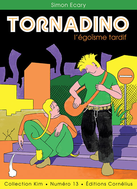 Eva vit là où elle ne connaît que Berry. Mais Berry n’est jamais assez, et parfois même, il devient trop. Elle voudrait rencontrer d’autres visages, partir au loin avec eux, partager leurs vacances et leurs cigarettes pleines de goudron. Ce serait peut-être l’occasion de fuir la tempête qui s’annonce, celle dont la rumeur a plongé la ville entière dans une torpeur sans élan. Jouant d’un univers réaliste teinté de touches fantastique, Simon Ecary tisse une histoire douce et cruelle, où des situations triviales prennent des allures de conte. À travers le récit d’une relation qui cherche à se redéfinir, l’auteur nous convie à un voyage où le désir de nouveauté se heurte à la perte. Porté par un dessin fluide et coloré, le livre s’anime de métaphores visuelles qui donnent corps aux états d’âme des personnages et plongent le lecteur dans un sentiment de rêve éveillé. Ces surgissements surnaturels servent moins de décor que de prétexte sensible à libérer l’imagination débordante de l’auteur. Visuellement, Tornadino puise dans un imaginaire bigarré — cartes postales des années 1970, jouets Kinder, anciens livres jeunesse tchèques — et dans l’énergie brute de certaines bande dessinée enfantines. Le titre, fausse piste volontaire, évoque la tornade mais surtout la relation entre Eva et Berry : un duo bavard mais sourd l’un à l’autre. Drôle, fantasque et parfois féroce, ce premier livre révèle un auteur inventif, porté par une énergie rare, qu’il faudra suivre de près.