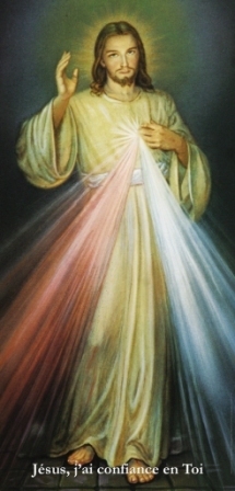 Affiche de Jésus miséricordieux, peinture d'Adolf Hyla (glissée dans un tube, 77x159 cm) avec la mention dictée par Jésus a sainte Faustine : Jésus, j'ai confiance en toi- F9