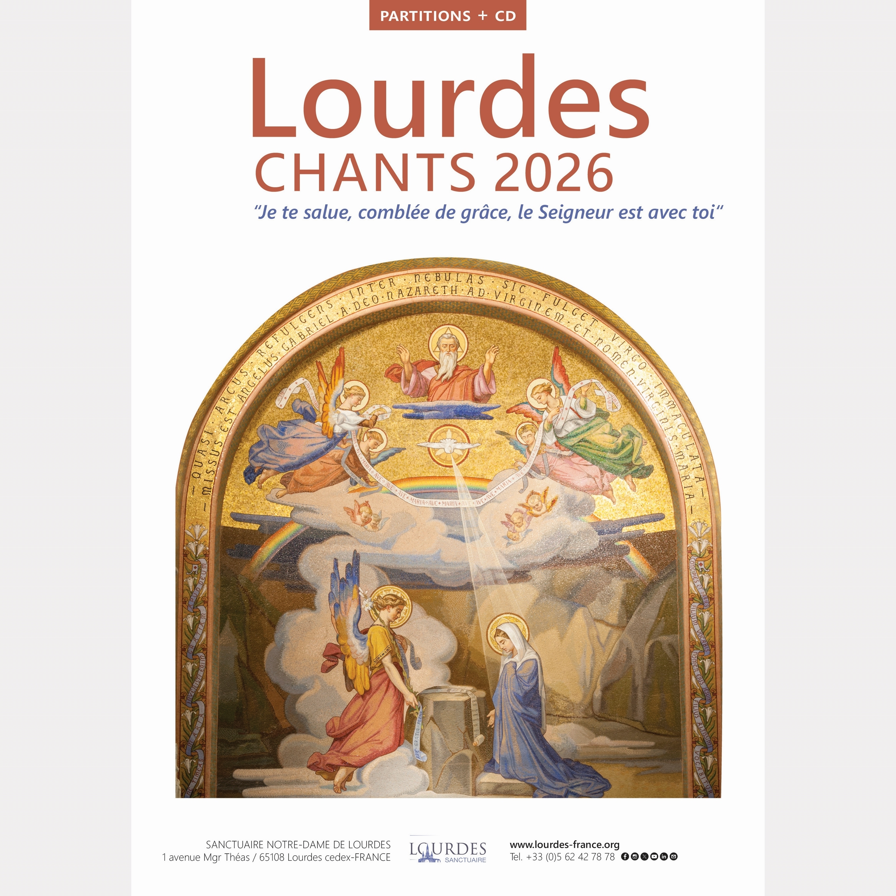 Les principaux chants et la messe (CD et partitions) composés pour le thème pastoral de Lourdes 2026 et enregistrés avec Isaia Ravelli, organiste titulaire et Maître de chapelle du Sanctuaire Notre-Dame de Lourdes. Le thème d’année retenu par le Sanctuaire de Lourdes pour 2026 sera l’Annonciation, avec plus précisément la phrase qui guidera toute la prochaine saison de pèlerinages : « Je te salue, comblée de grâce, le Seigneur est avec toi » (Lc 1,28). Ce livre-CD reprend les chants principaux choisis pour la messe du thème pastoral de Lourdes 2026 et composés par Isaia Ravelli, organiste titulaire et Maître de chapelle du sanctuaire. Le CD propose le chant-thème de l’année Ecce ancilla Domini (« Voici la servante du Seigneur »). Il sera suivi d’un Kyrie, d’un Gloria, d’un psaume responsorial et d’un chant de communion, Ego sum Panis vivus (« Je suis le Pain vivant »), tous de nouvelles compositions. L’Alléluia et l’Agnus Dei seront ceux de la messe en l’honneur de sainte Bernadette (composée en juin 2025 pour le centenaire de sa béatification). Le livret comprend les chants en version multilingue (français, italien, espagnol, anglais, allemand, néerlandais), l’accompagnement d’orgue et les contrechants de trompette en Ut et Sib.