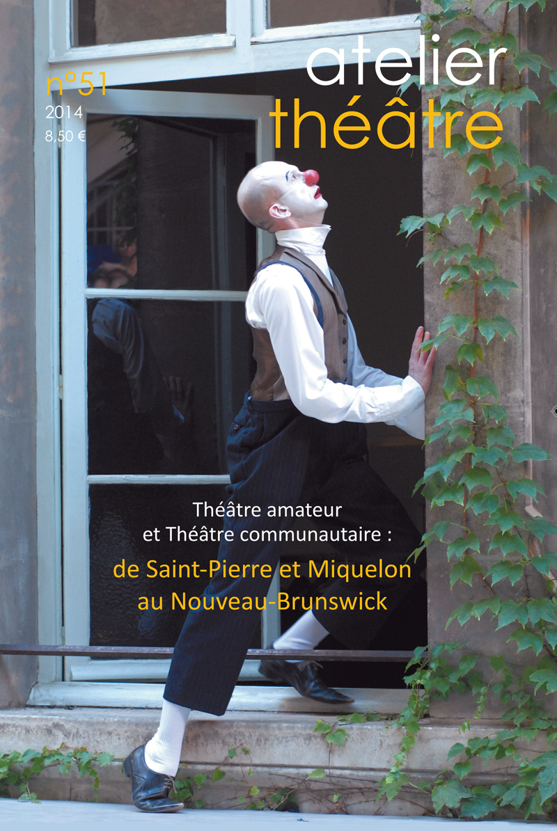 Numéro 51 Numéro spécial : Théâtre amateur - Théâtre communautaire de Saint-Pierre et Miquelon au Nouveau-Brunswick Magazine - Rencontre avec Isabelle Astier, comédienne, auteur, metteur en scène - Dossier : Carnet de bord : Voyage théâtral sur l’Île de Miquelon - Avril 2013 - Dossier : L’expérience d’Isabelle Astier ou Le théâtre communautaire comme vecteur de développement social des territoire. - Le théâtre amateur - Le théâtre communautaire. Du théâtre, parait-il ! . - Le grand ramassage des peurs. Entretien avec Christian Duchange, de la Compagnie de L’Artifice à Dijon - La Grande Cueillette des mots, un théâtre citoyen - Des livres pour aller plus loin À vous de jouer (thème: Saint-Pierre et Miquelon ) - Et l’Acadie, Majesté? d’Alain Dubos (scène adulte, extrait) - Salle de bal d’Isabelle Astier (scène ado, extrait) - Vie d’exil de Blandine Baudrillart en collaboration avec Jean-Pierre Detcheverry (scène enfants)
