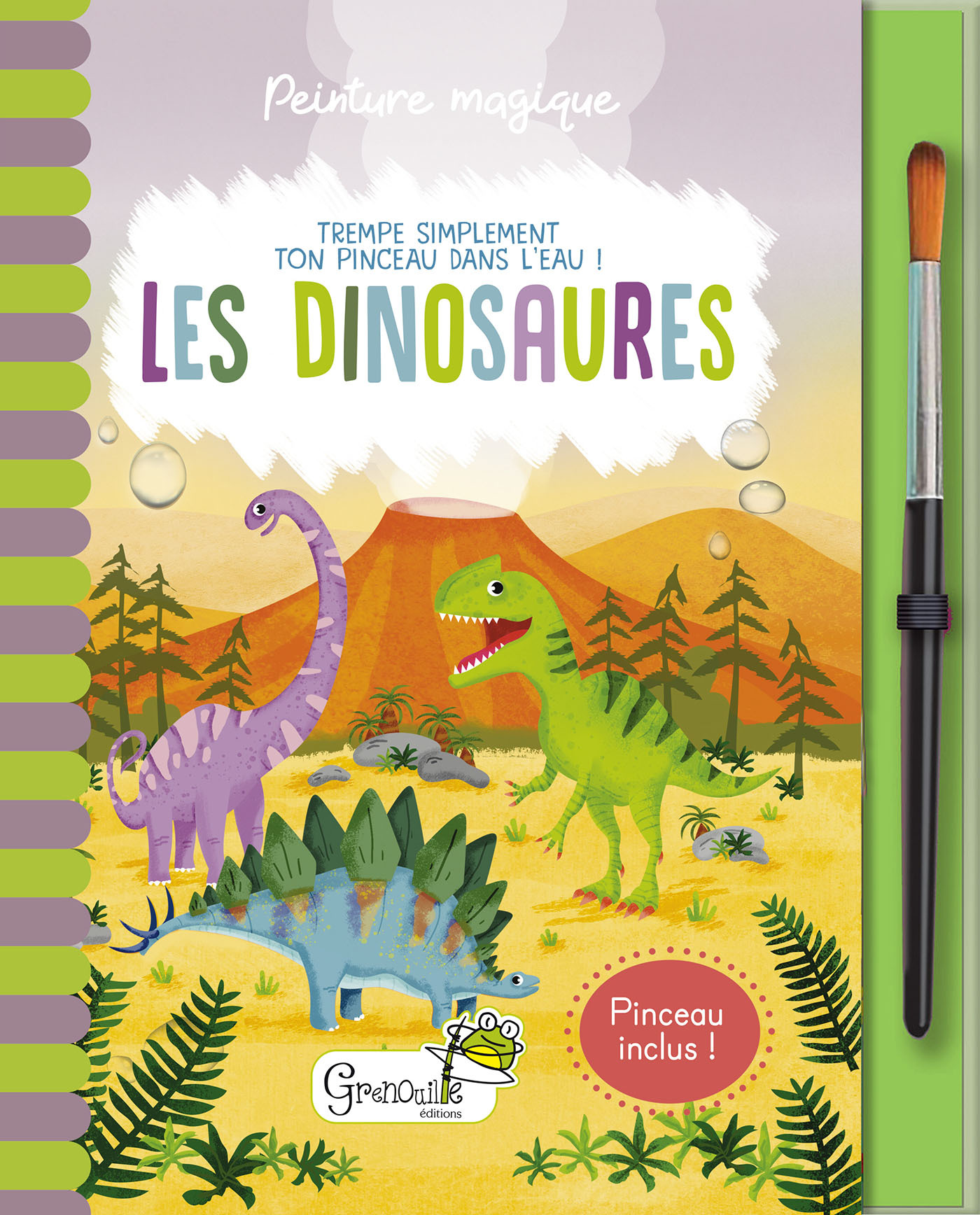 Une goutte d'eau et le tour est joué ! CONTENU : 16 illustrations magiques à peindre, des illustrations à colorier aux feutres ou aux crayons de couleur, ainsi que des informations passionnantes sur les dinosaures. Pour révéler les couleurs des illustrations, il suffit de tremper le pinceau dans l'eau. Lorsque l'enfant passe son pinceau sur la page, les couleurs apparaissent. En séchant, la page ainsi peinte redevient blanche, pour recommencer à l'infini !