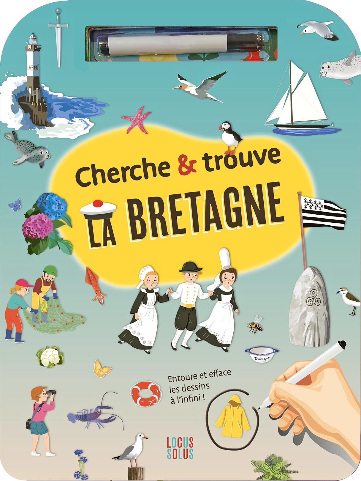 Tout l’univers de la Bretagne concentré en onze doubles-pages : ses coutumes, sa faune, sa flore, sa gastronomie, son histoire médiévale et bien sûr ses légendes ! Dans chaque décor se cachent entre 10 et 15 dessins, plus ou moins difficiles à repérer. Le feutre effaçable à sec, fourni avec le livre, permet d’entourer les solutions, puis de les effacer, pour recommencer le jeu à l’infini. La qualité graphique et la richesse du contenu en font un support familial, très ludique. Les adultes aussi vont se prendre au jeu !