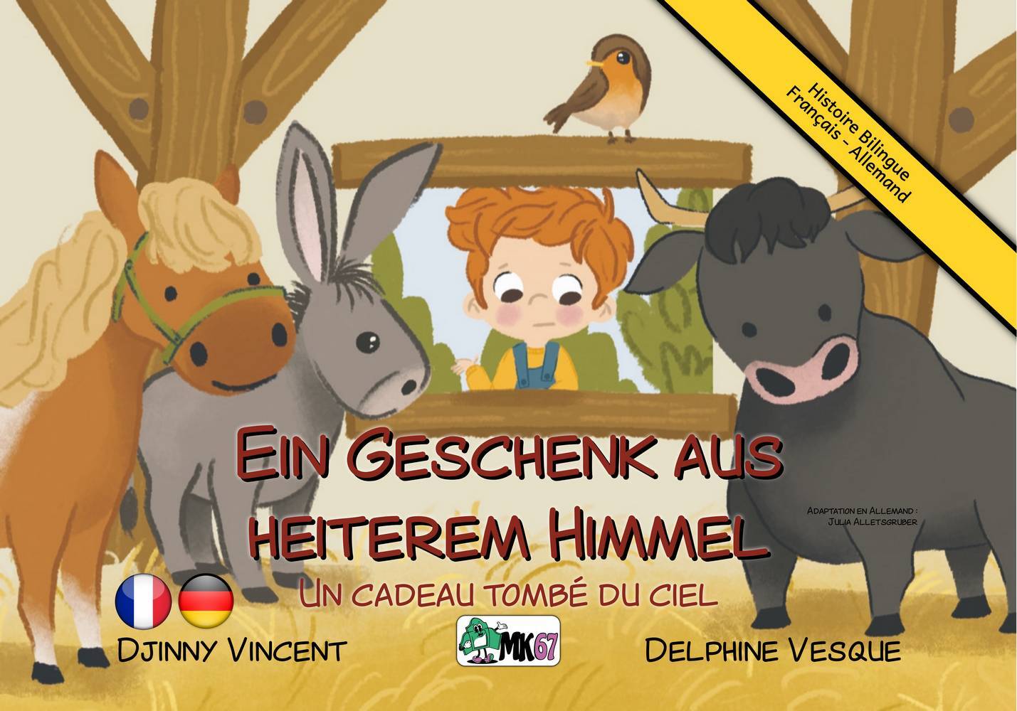 In einem kleinen Dorf im Süden Frankreichs entdecken ein Pferd, ein Esel, ein Stier und ein Vogel in ihrem Gehege ein seltsames Paket, das offenbar vom Himmel gefallen ist. Was werden unsere Freunde tun? Neugierig nähern sie sich dem geheimnisvollen Gegenstand … Ein Märchen über das Teilen und die Großzügigkeit – mit einer Prise Neugier! Zweisprachige Geschichte (Französisch–Deutsch) im Kamishibai-Format Erhältlich in den Formaten Traditionell (37 x 27,5 cm), A3 (42 x 29,7 cm) und A4 (29,7 x 21 cm) Castelet / Butai nicht enthalten