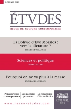 Publiée depuis 160 ans par des jésuites, la revue s’inscrit dans une tradition d’un dialogue ouvert et positif avec la culture contemporaine. Elle demeure l’une des revues intellectuelles françaises les plus lues, avec une reconnaissance qui dépasse les clivages politiques et religieux. Abordant aussi bien les questions internationales que les grands enjeux de société, ou encore les débats au sein de l’Eglise, elle également réputée pour l’originalité et la sélectivité de ses carnets culturels, en particulier dans le domaine du cinéma et du livre. ----------------------------- Quelques articles phares de OCTOBRE 2019 : International : • Bolsonaro et l’environnement au Brésil, par Raphaël Gutman Société : • Benoît Helbrunn : Dictature du bien-être • Fondations et fonds de dotation en France • Anonymat du don de gamète Religion : • Grand entretien avec Christoph Théobald sur les urgences pastorales Culture : • Le succès du polar • L’anniversaire de Berlioz