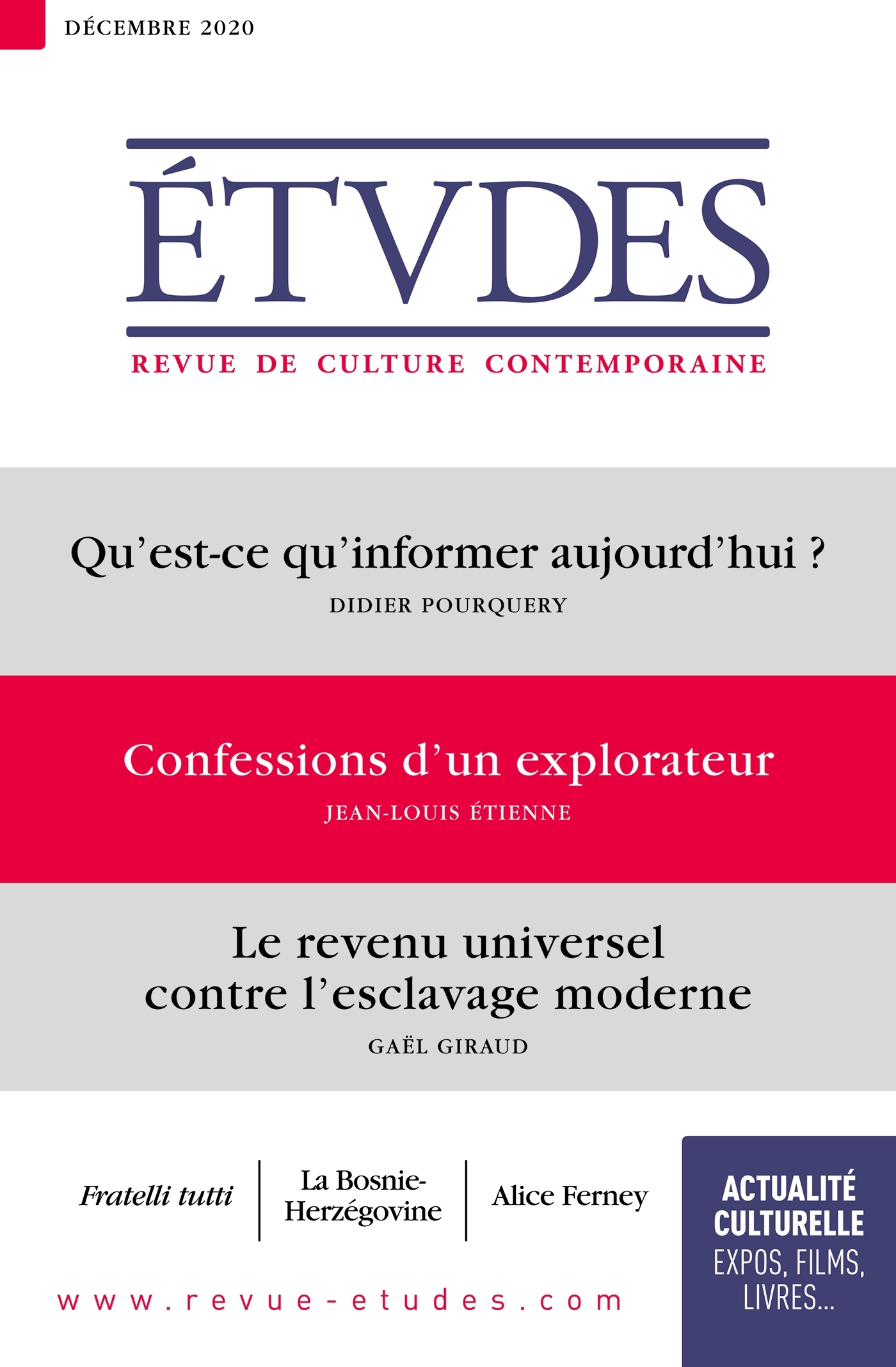 S'informer - Approfondir - Discerner Publiée depuis 160 ans par des jésuites, la revue s'inscrit dans une tradition d'un dialogue ouvert et positif avec la culture contemporaine. Elle demeure l'une des revues intellectuelles françaises les plus lues, avec une reconnaissance qui dépasse les clivages politiques et religieux. Abordant aussi bien les questions internationales que les grands enjeux de société, ou encore les débats au sein de l'Eglise, elle également réputée pour l'originalité et la sélectivité de ses carnets culturels, en particulier dans le domaine du cinéma et du livre.