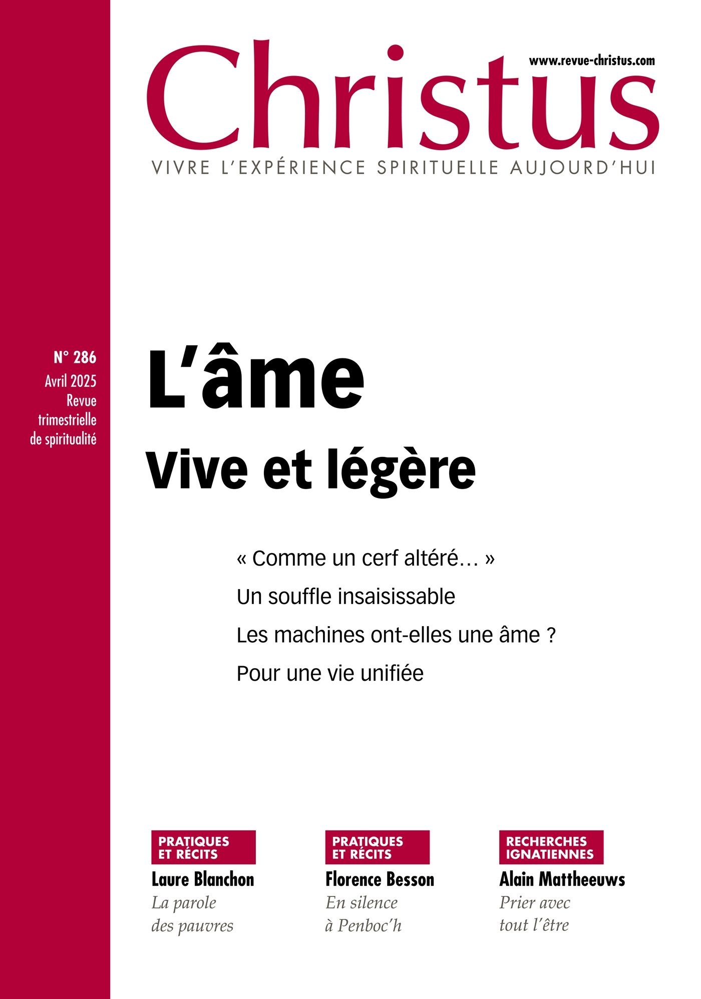 Christus est une revue d’approfondissement spirituel qui s’inspire de la tradition de saint Ignace de Loyola. Chaque numéro aborde les différents aspects d’une grande question sous un angle spirituel, avec des contributions d’auteurs reconnus, laïcs ou religieux. Voici des exemples de thèmes récemment abordés : l’expérience de la perte, la conversion, la répétition, le bien commun, la douceur… L’âme L’âme, qui avait été reléguée au grenier du vocabulaire chrétien, fait un retour remarquable. Longtemps associée à un discours culpabilisant sur le péché, elle apparaîtà nouveau dans toute sa légèreté, fil vital, souffle mystérieux qui nous conduit au cœur de notre être et nous met en relation avec Dieu. Ce dossier se tourne vers les grands connaisseurs de l’âme, saints (saint Jean de la Croix, Hildegarde de Bingen) et poètes (Marie Noël), mais aussi vers les problématiques très actuelles de notre rapport aux animaux et aux machines. Ce dossier aide à comprendre ce que beaucoup cherchent aujourd’hui : se libérer d’un rationalisme desséchant. La conception chrétienne de l’âme, enracinée dans la Bible et dans l’Evangile, rappelle que l’âme est fragile, libre et faite pour un amour sans mesure. Avec : les biblistes Guy Vanhoomissen et Bertrand Pinçon, la philosophe Bénédicte Bouillot, l’historien Franck Damour, père Arnaud Montoux, le sinologue Yves Vendé, l’écrivaine Aurore-Marie Guillaume, le carme Anthony-Joseph Pinelli…