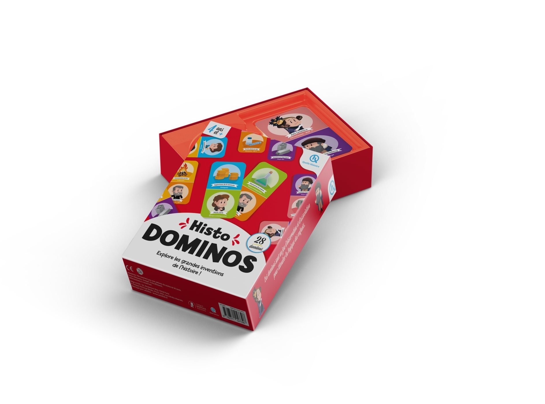 Un jeu de dominos pour découvrir les grandes inventions de l’histoire et s’amuser à faire des associations, dès 4 ans. BUT DU JEU : Se débarrasser de tous ses dominos PRÉPARATION : Mélanger puis distribuer les dominos, face cachée. Pour 2 joueurs, chacun reçoit 7 dominos ; s’il y a 3 ou 4 joueurs, il faut en donner 6 à chacun. Le reste constitue la pioche. DÉROULEMENT : Le joueur le plus jeune commence et pose le domino de son choix, face visible. Le suivant doit ajouter un domino de son jeu pour l'associer à une des couleurs posées (ou, pour les plus grands, associer un inventeur à son invention). Si le joueur ne peut placer aucun domino, il doit en piocher un et céder son tour à son voisin. Le premier qui a posé tous ses dominos, ou à qui il en reste le moins à la fin, gagne la partie ! Nombre de joueurs : 2 à 4 joueurs Durée du jeu : 15 minutes Âge : 4 ans et +