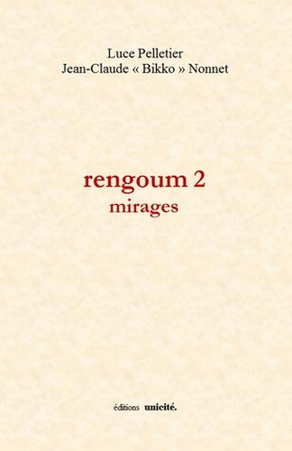 « Rengoum »? Rassurez-vous, c’est un mot inventé il y a quelques années à peine. Nul besoin d’en savoir plus long pour plonger avec délice dans ce deuxième recueil du dynamique duo formé par Luce Pelletier et Jean-Claude « Bikko » Nonnet, l’une basée au Québec et l’autre en France. Les échanges sont toujours étonnants, souvent percutants... Au fil des pages, vous vous laisserez doucement en-voûter par le rythme subtil des vers et l’éventail de leurs échos, dialogue fluide où les thèmes de l’eau, de la rivière, de la mer, du sable sont autant de métaphores aux va-et-vient de ces complices hors pair... « Abîme infranchissable », vraiment ? Je n’en crois rien du tout, après avoir lu et relu cet ovni poétique que vous avez sous les yeux. C’est que Luce et Bikko nous tendent la main et nous invitent à franchir allègrement ce passage entre l’âme occidentale et l’âme orientale, rien de moins : le mirage est dissipé, l’abîme envolé ! Voilà que les deux âmes semblent ici se réconcilier, sans plus de tambour ni trompette, grâce à la magie du rengoum et de la connivence de nos deux poètes. Ne reste plus qu’à souhaiter longue vie au rengoum ! Extrait de la préface de Jeanne Painchaud