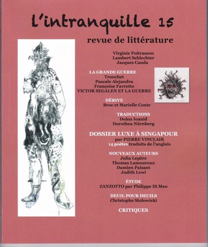 Revue de création, d’actualité littéraire, de traductions, d’histoire littéraire, journaux intimes, arts, poésie. DOSSIER TRADUCTION « POÈTES DE SINGAPOUR » TRADUITS DE L’ANGLAIS PAR PIERRE VINCLAIR DOSSIER THÉMATIQUE « LA GUERRE DE 14-18 » une études de JEAN ESPONDE sur VICTOR SEGALEN ET LA GUERRE. TEXTES DE FRANÇOISE FAVRETTO ET PASCALE ALEJANDRA ILLUSTRATIONS : TRONCHET, ANNE-MARIE WEYERS, CENDRES LAVY, JOHANNA LANTERNIER, FANNY DANGLADE CRITIQUES DE LIVRES par Jean-Pierre Bobillot, Françoise Favretto, Myrto Gondicas.