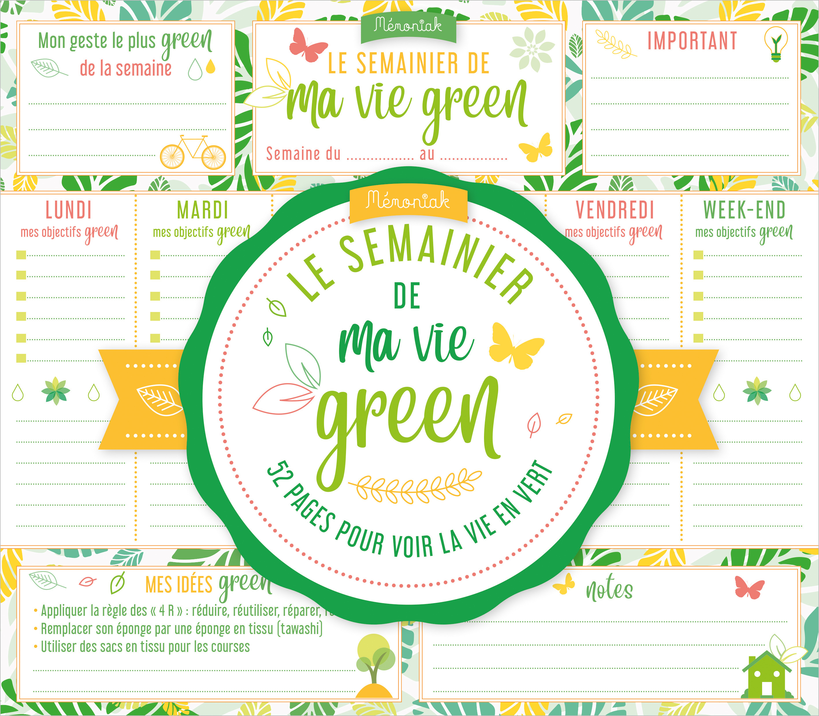 Un sous-main très pratique pour s’organiser chaque semaine et se fixer des objectifs pour une vie plus écolo et plus saine : On y retrouve : - Les objectifs green et anti-gaspi de la semaine et des espaces pour noter ses rendez-vous - Sa fierté de la semaine - Des espaces de notes - Des conseils et idées pour un mode de vie plus écolo