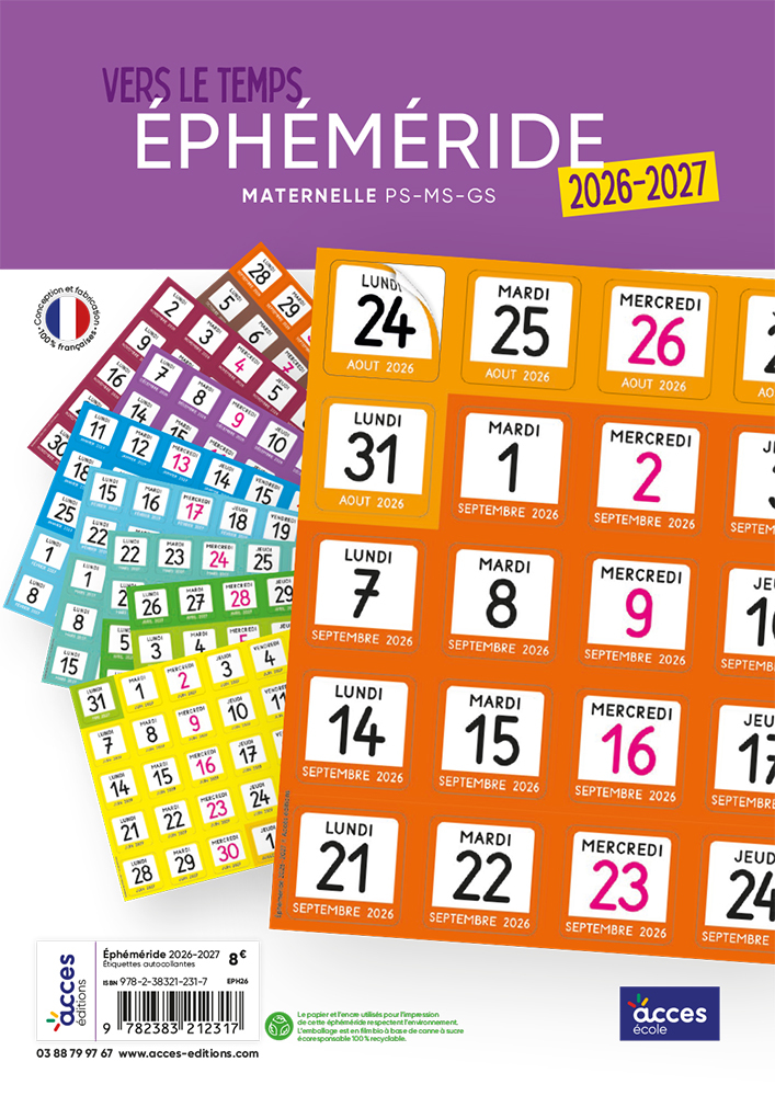 Proposée sous forme d’étiquettes autocollantes, l'éphéméride s’utilise de la PS à la GS en accompagnement des calendriers proposés dans les compléments numériques disponibles depuis votre guide de l'enseignant VERS LE TEMPS Maternelle. Les étiquettes autocollantes sont fournies au format carré de 3,5 cm.