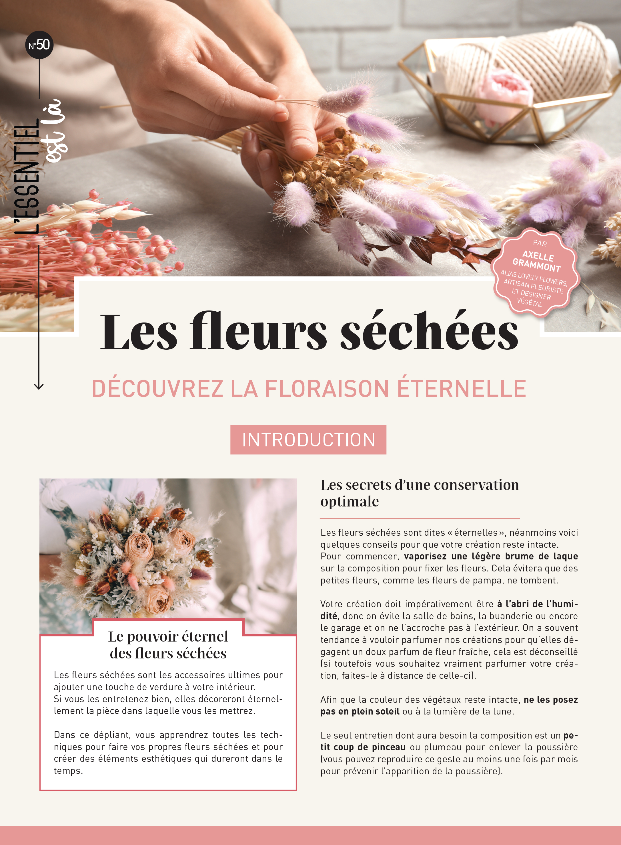 Un dépliant de 6 pages au toucher soft touch pour sublimer son intérieur grâce à des bouquets de fleurs séchées : des fleurs éternelles. Très à la mode, les fleurs séchées offrent de multiples possibilités de création : sous cloche, en couronne, en tableau mural…. Depuis le séchage des fleurs jusqu’à la réalisation d’un premier objet de décoration en passant par les petits secrets d'une professionnelle, rien ne sera oublié.