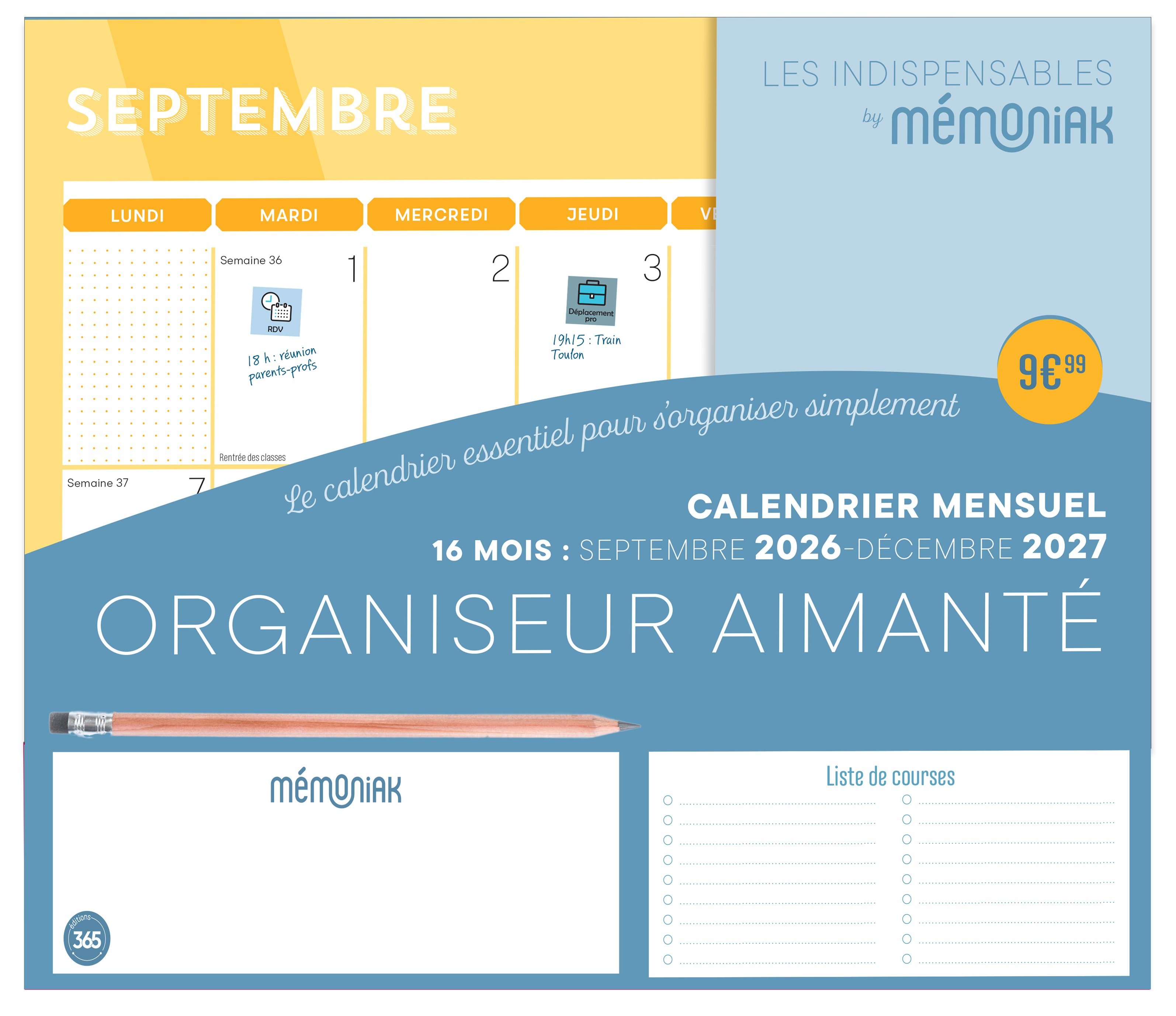 Découvrez dans la collection Les indispensables by Mémoniak pour une organisation immédiate et simple : l'organiseur aimanté mensuel à 9,99€ Planifiez votre année avec une double page mensuelle pour tout noter et visualiser son mois en un coup d'oeil sur 16 mois de Septembre 2026 à Décembre 2027 + 1 pochette pour ranger coupons et tickets de caisse + 1 bloc de listes de courses détachables + 1 crayon à papier offert + 650 autocollants pour une organisation visuelle avec les enfants + 2 trombones pour maintenir les pages + 1 espace notes pour inscrire les tâches urgentes + 8 aimants super solides pour aimanté son calendrier au frigo Le savoir-faire Mémoniak des Editions 365 Calendrier mensuel aimanté, 16 mois, septembre 2026 à décembre 2027