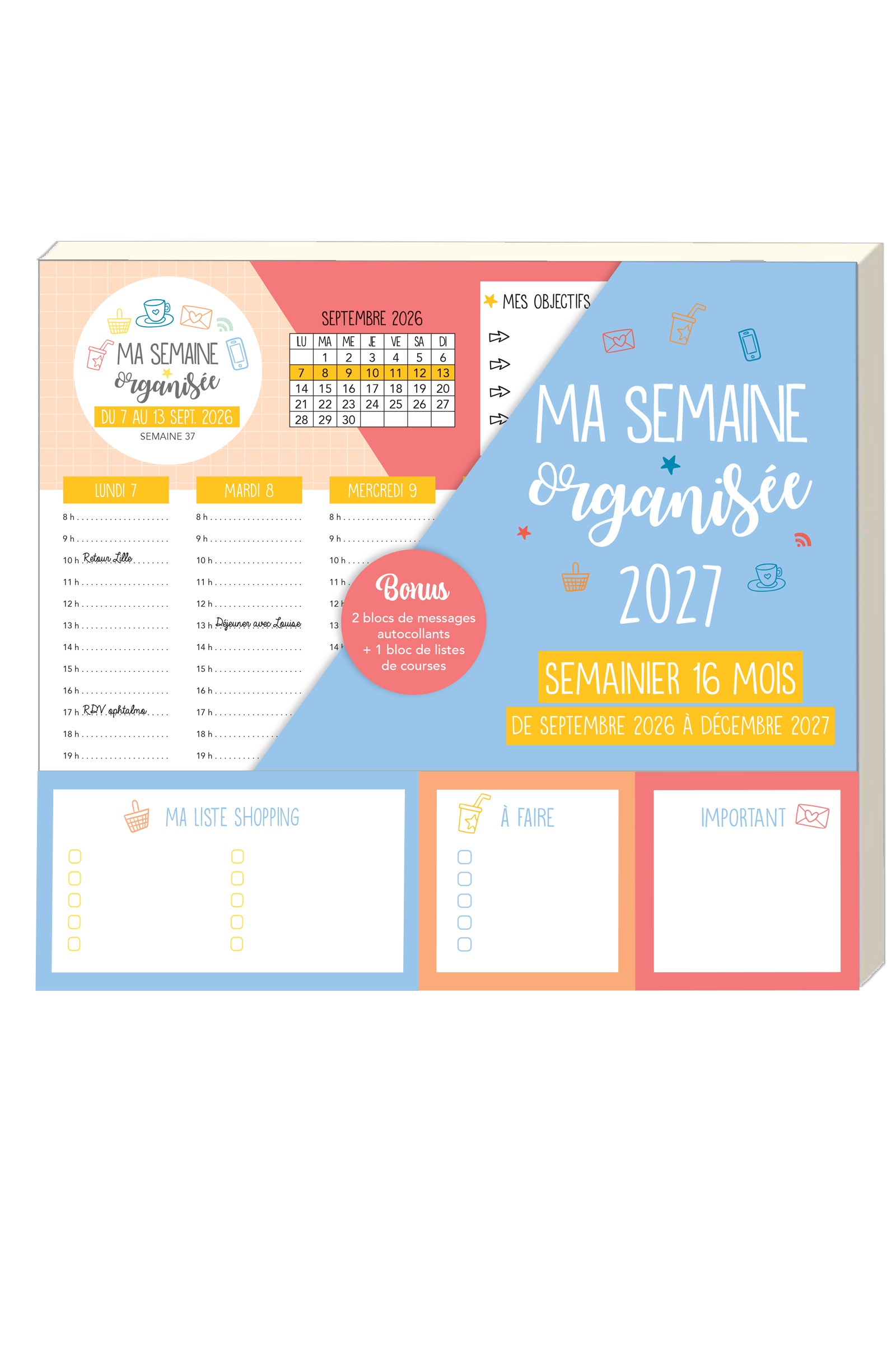Ce joli semainier vous propose une grande page par semaine avec de la place pour noter ses rendez-vous et activités de la semaine : dentiste, déjeuner ou sport, suivez votre emploi du temps de la semaine en un seul coup d’œil ! Le plus : - un petit espace pour noter ses objectifs de la semaine - 2 petits blocs de post-it détachables où vous pouvez noter les choses à faire ou importantes - Un bloc-notes détachable sur lequel inscrire votre liste de courses pour l'emporter avec vous L'outil idéal pour une bonne organisation, sans stress ! Semainier sur 16 mois, une semaine par page, de septembre 2026 à décembre 2027. Format : 21 x 24 cm / 142 pages