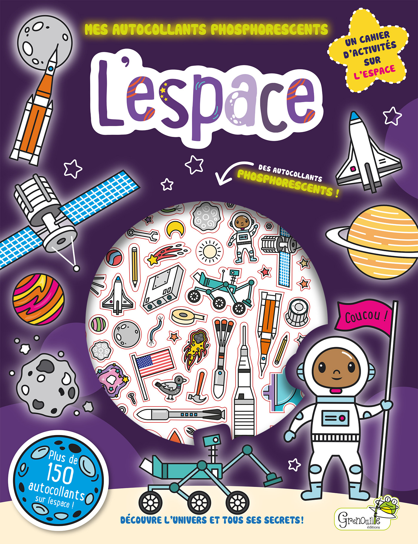 Un cahier d'activités sur le thème de l'espace qui propose une multitude de jeux, mais également : - Des stickers « classiques » pour décorer le cahier ou d'éventuels dessins réalisés par l'enfant, - Une pochette collée sur la 2ème de couv', contenant des stickers phosphorescents, à coller sur les fenêtres pour que la chambre brille de mille feux la nuit !