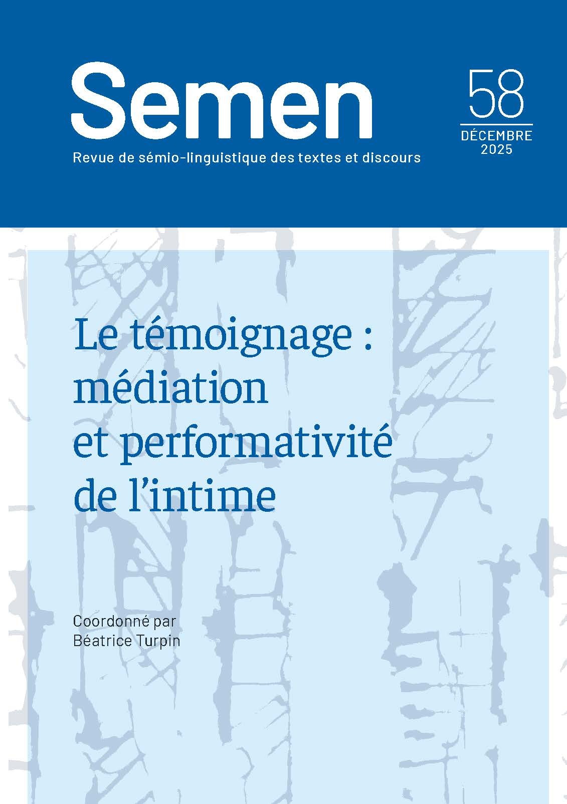 Dans une approche interdisciplinaire et à partir de formes sémiotiques diverses, ce numéro de Semen interroge l’intime tel qu’il se dit actuellement dans le témoignage, conçu ici comme acte d’interaction à dimension performative.
