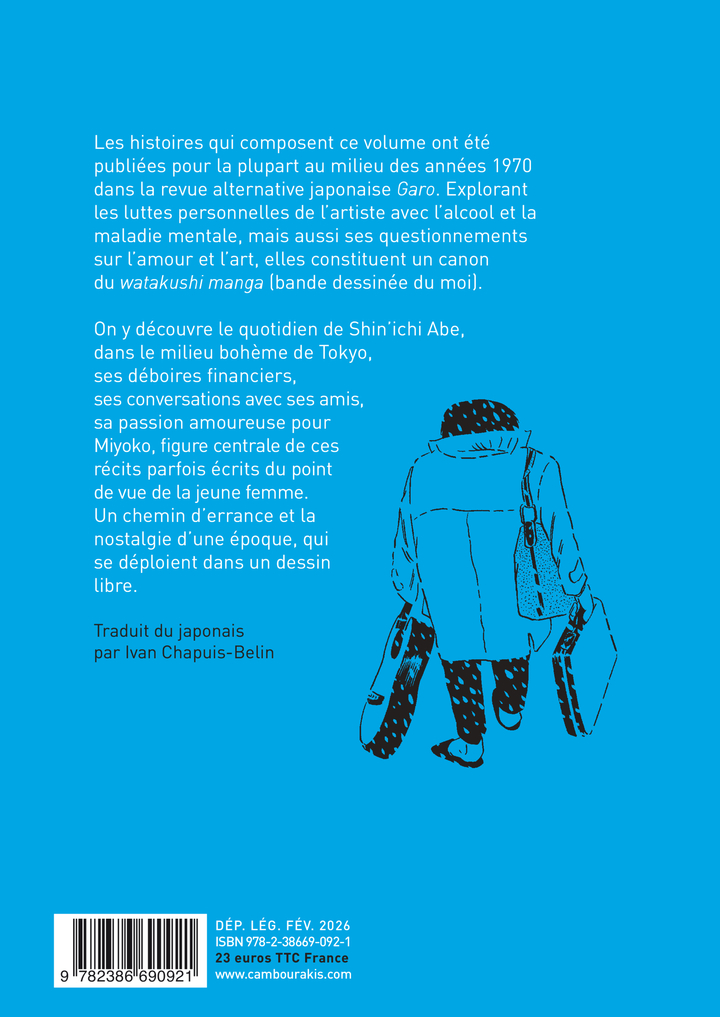 Les histoires qui composent ce volume ont été publiées pour la plupart au milieu des années 1970 dans la revue alternative japonaise Garo. Explorant les luttes personnelles de l'artiste avec l'alcool et la maladie mentale, mais aussi ses questionnements sur l'amour et l'art, elles constituent un canon du watakushi manga (bande dessinée du moi). On y découvre le quotidien de Shin'ichi Abe, dans le milieu bohème de Tokyo, ses déboires financiers, ses conversations avec ses amis, sa passion amoureuse pour Miyoko, figure centrale de ces récits parfois écrits du point de vue de la jeune femme. Un chemin d'errance et la nostalgie d'une époque, qui se déploient dans un dessin libre. Traduit du japonais par Ivan Chapuis-Belin Né en 1950 à Tagawa, une ville minière du sud du Japon, Shin'ichi Abe fut l'un des piliers de la revue Garo, fer de lance du manga d'avant-garde dans les années 1970. Aujourd'hui, ses histoires paraissent dans le magazine japonais Ax, spécialisé dans le manga underground. En France, ont notamment été publiés : Paradis (éditions Picquier, 2006), Une bien triste famille et Les Amours de Taneko (éditions du Seuil, 2006 et 2007).