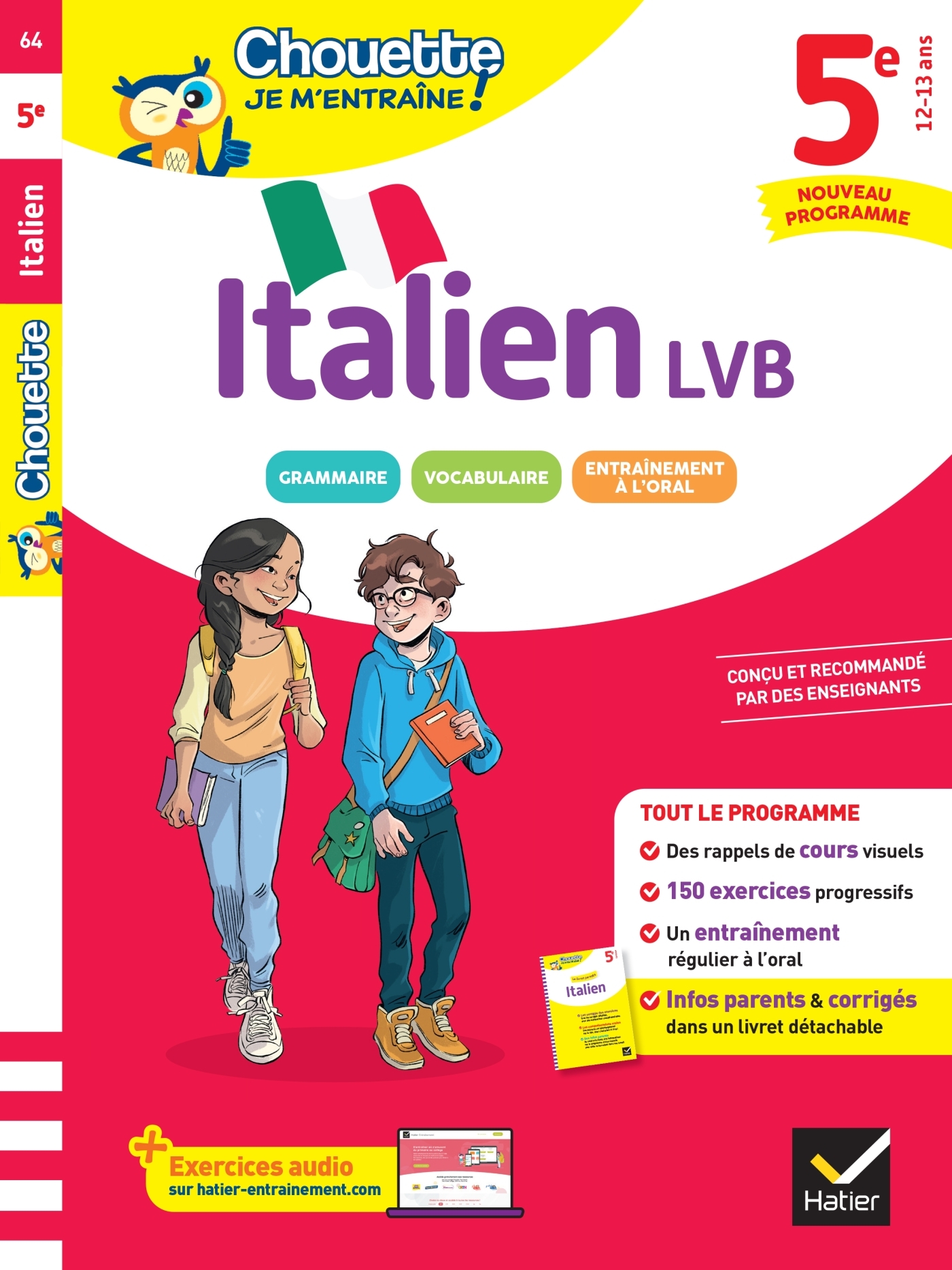 Le cahier d’entraînement Italien 5 e pour réviser les points clés du programme et s’entraîner à l’écrit comme à l’oral. Avec 150 exercices corrigés, des ressources audio et un livret parents détachable ! Sur chaque thème du nouveau programme de grammaire en Italien 5 e • Un rappel de cours clair et visuel • Des exercices progressifs • Des conseils pour comprendre et réussir À intervalles réguliers Des exercices pour enrichir son vocabulaire et améliorer sa compréhension orale, avec des compléments audio. Dans le livret parents détachable • Les corrigés détaillés des exercices, avec le commentaire des difficultés • Des informations sur le programme • Des conseils pour aider votre enfant dans son travail Sur le site https://entrainement.editions-hatier.fr/ De nombreuses ressources complémentaires pour réviser autrement : – des exercices interactifs en Français et en Maths – des dictées sonorisées – des activités audio en langues vivantes