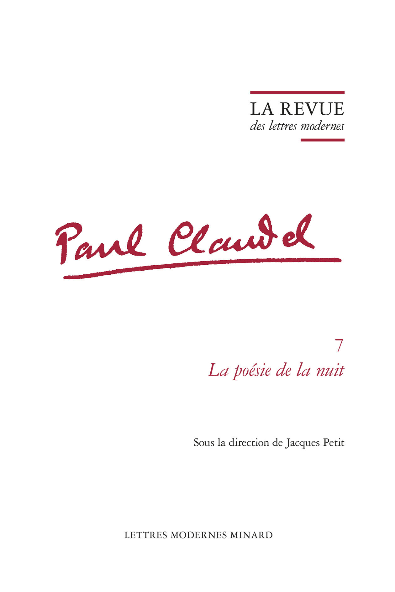 La critique a plus souvent été sensible, dans l'oeuvre claudélienne, à la lumière, à la flamme, au soleil. Pourtant, Claudel a ressenti, non sans une forme de complaisance, l'attrait et l'effroi de la nuit. Les études publiées ici s'attachent à multiplier les points de vue sur cette nuit claudélienne.