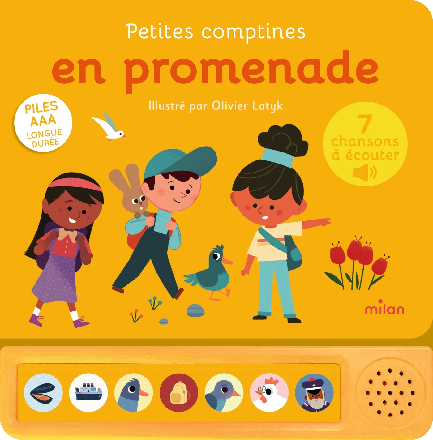 Retrouvez des comptines pour vadrouiller dans un livre sonore adapté aux tout-petits, dès 1 an ! Une invitation à l'évasion Ces comptines embarquent le tout-petit dans un univers drôle et poétique où chaque comptine devient une promenade imaginaire. À la pêche aux moules, Bon voyage, monsieur Dumollet, Dans la ferme de Mathurin, Un kilomètre à pied, En passant par un p'tit bois, Quand trois poules vont aux champs, Cinq petits doigts voyageurs : autant de chansons pour explorer le monde ! Un livre pour se balader et contempler Les illustrations rigolotes et colorées d'Olivier Latyk embarquent le tout-petit à la mer , à la ferme et dans la forêt , lui permettant ainsi de parcourir et contempler de nouvelles contrées. Parfait pour développer l'autonomie Les livres de la collection des « Contes et comptines à écouter » sont idéaux pour favoriser l' autonomie des enfants. Une fabrication solide et de gros boutons simples à enclencher : la découverte musicale est ainsi à portée de main !