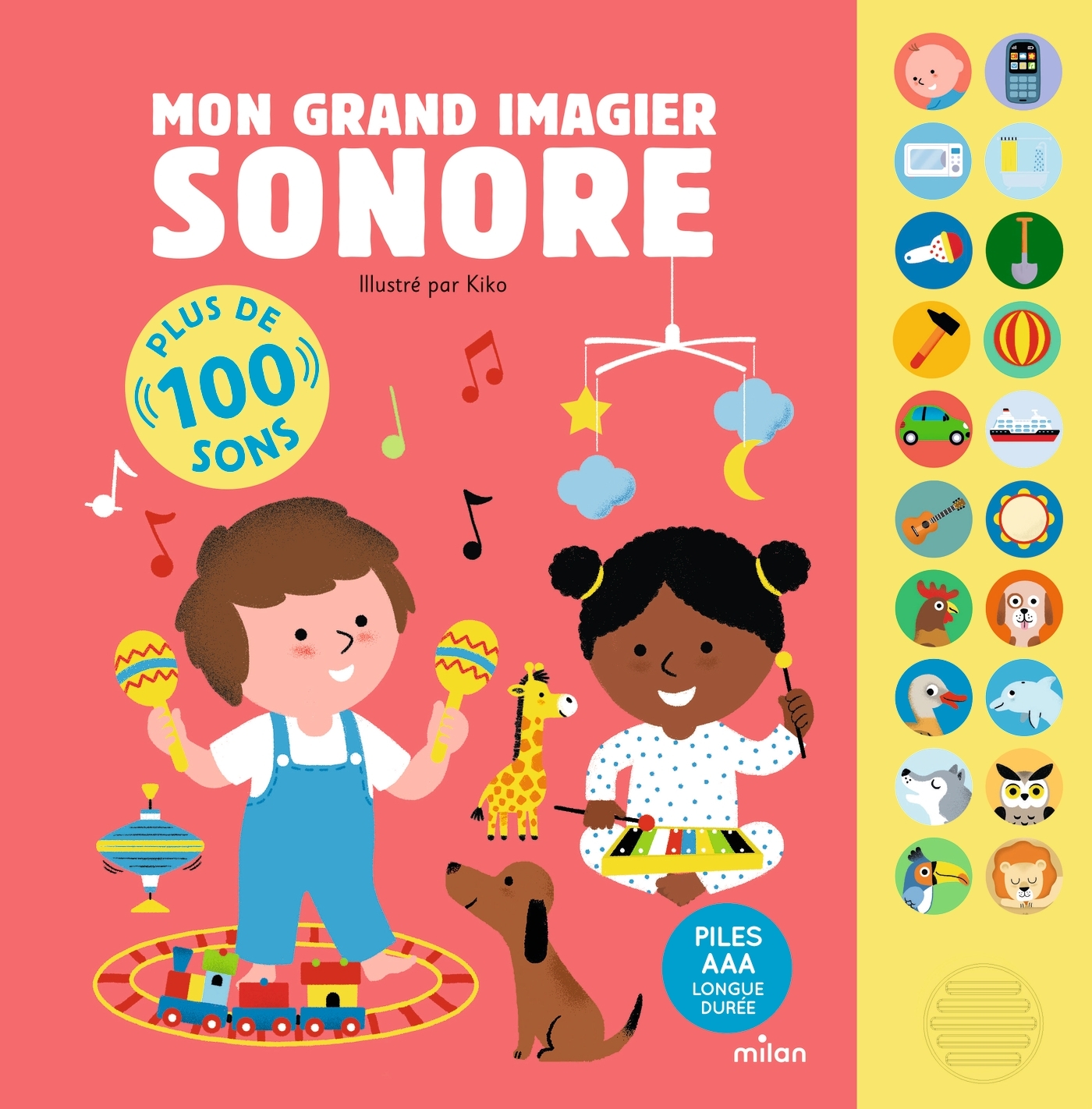 Avec ce livre incontournable, Milan propose aux enfants bien plus qu'un imagier ! Au fil des pages et des univers, c'est une véritable petite encyclopédie sonore , composée de plus de cent mots à nommer et de sons à écouter, qui leur permettra de découvrir le monde qui les entoure. Un imagier encyclopédique Voici un livre sonore complet qui ravira tous les petits curieux ! Cet imagier grand format, conçu comme une encyclopédie des sons, parcourt les principales thématiques proches du quotidien de l'enfant : les animaux, les véhicules, les instruments, les objets de la maison... Dans ce nouvel imagier sonore grand format, l'enfant s'émerveillera à écouter plus de cent sons reflétant l'environnement sonore associé à son quotidien. Une fabrication adaptée aux tout-petits Le grand format cartonné et le boîtier doté de vingt puces sonores faciles à déclencher permettent à l'enfant une écoute et une lecture en toute autonomie . Succès garanti à partir de 9 mois. Cerise sur le gâteau, le livre est équipé de piles longue durée ! - Le Progrès
