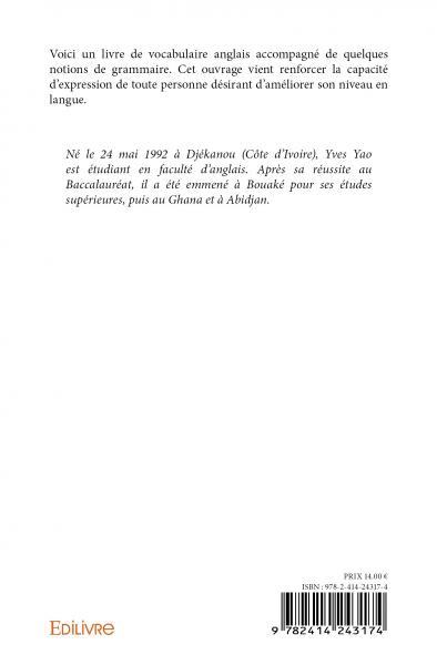 Voici un livre de vocabulaire anglais accompagné de quelques notions de grammaire. Cet ouvrage vient renforcer la capacité d'expression de toute personne désirant d'améliorer son niveau en langue.