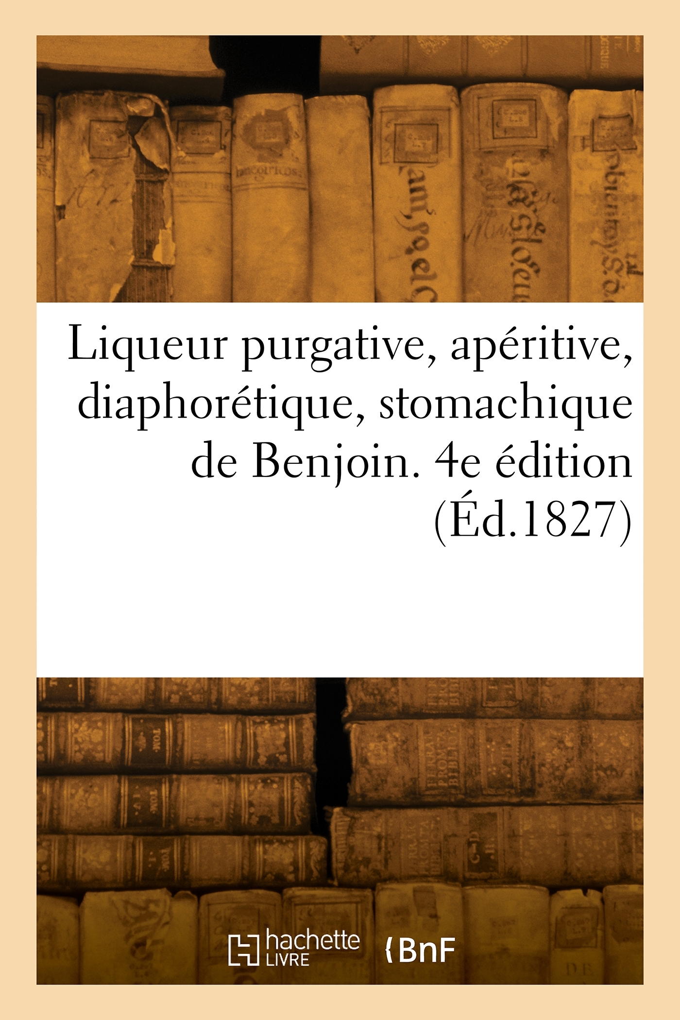 Liqueur de Benjoin, composée . Elle est purgative, apéritive, diaphorétique, stomachique, etc. Quatrième édition, augmentée en citations, ainsi que de l'indication d'un élixir de Benjoin non purgatif Date de l'édition originale : 1827 Le présent ouvrage s'inscrit dans une politique de conservation patrimoniale des ouvrages de la littérature Française mise en place avec la BNF. HACHETTE LIVRE et la BNF proposent ainsi un catalogue de titres indisponibles, la BNF ayant numérisé ces oeuvres et HACHETTE LIVRE les imprimant à la demande. Certains de ces ouvrages reflètent des courants de pensée caractéristiques de leur époque, mais qui seraient aujourd'hui jugés condamnables. Ils n'en appartiennent pas moins à l'histoire des idées en France et sont susceptibles de présenter un intérêt scientifique ou historique. Le sens de notre démarche éditoriale consiste ainsi à permettre l'accès à ces oeuvres sans pour autant que nous en cautionnions en aucune façon le contenu. Pour plus d'informations, rendez-vous sur www.hachettebnf.fr