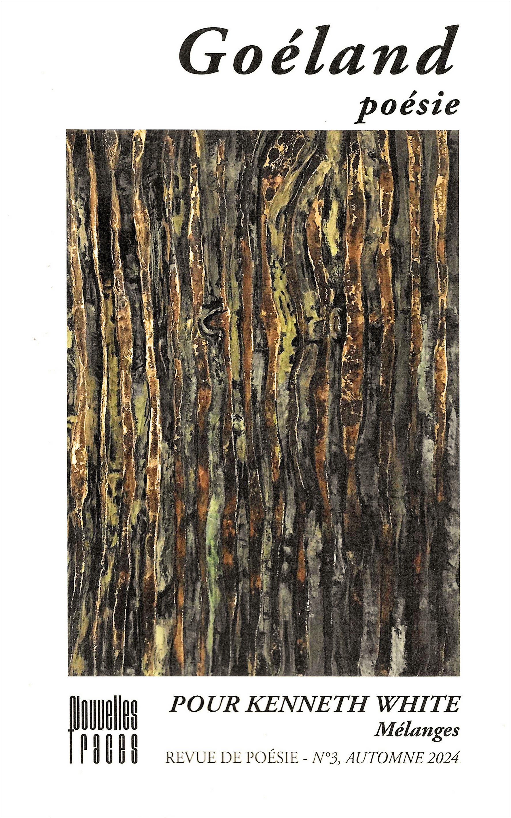 Dans son troisième opus « Mélanges » la revue de poésie Goéland célèbre la vivacité poétique de Kenneth White, à travers la contribution de géopoètes francophones. Une vingtaine de textes – poèmes, témoignages et postures critiques – révèlent le rapport intime de l’être humain à sa planète, pour ne pas dire son environnement immédiat ; une expérience décisive éprouvée très jeune par Kenneth White, qui le conduira à explorer le monde à la recherche d’une trace similaire au sein des diverses cultures et individualités.