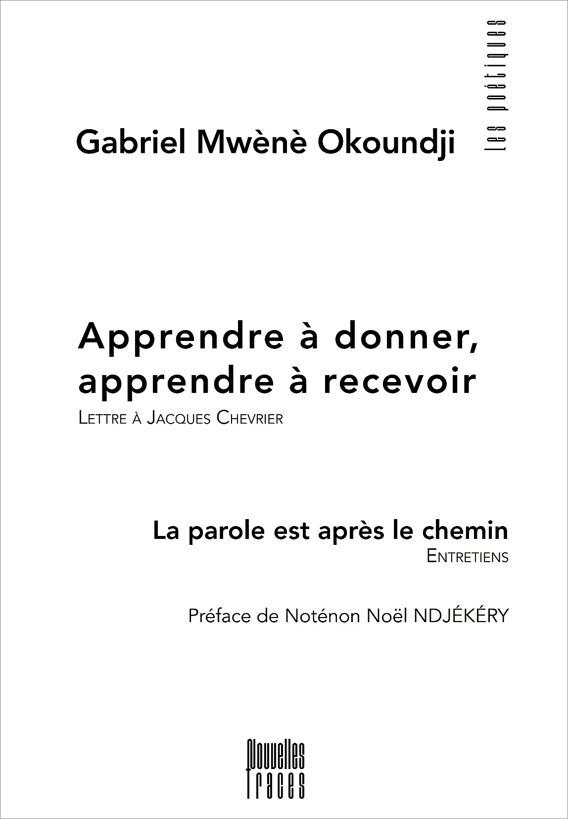 La démarche poétique de Gabriel Okoundji est animée d’un vécu initiatique reçu dans sa contrée natale, le Congo, une sorte de transmission orale qui l’engage à devenir garant du pouvoir moral traditionnel et porteur de la voix des aînés : le mwènè. Ampili la conteuse, sa tante-mère, et Pampou le sage comptent parmi les initiateurs primordiaux. Viendront ensuite les rencontres littéraires – écrivains, philosophes, poètes – qui ne cesseront d’accompagner son évolution jusqu’à Bordeaux, où il finira par s’installer, absorbant une culture complémentaire et approfondissant sa connaissance des rouages de la pensée humaine. Ainsi le poète est-il dans un échange permanent, il reçoit puis donne en retour. Texte suivi d’entretiens avec Caya Makhélé, Elsa Gribinski et Pierre Tillinac. Ouvrage bilingue français/espagnol.