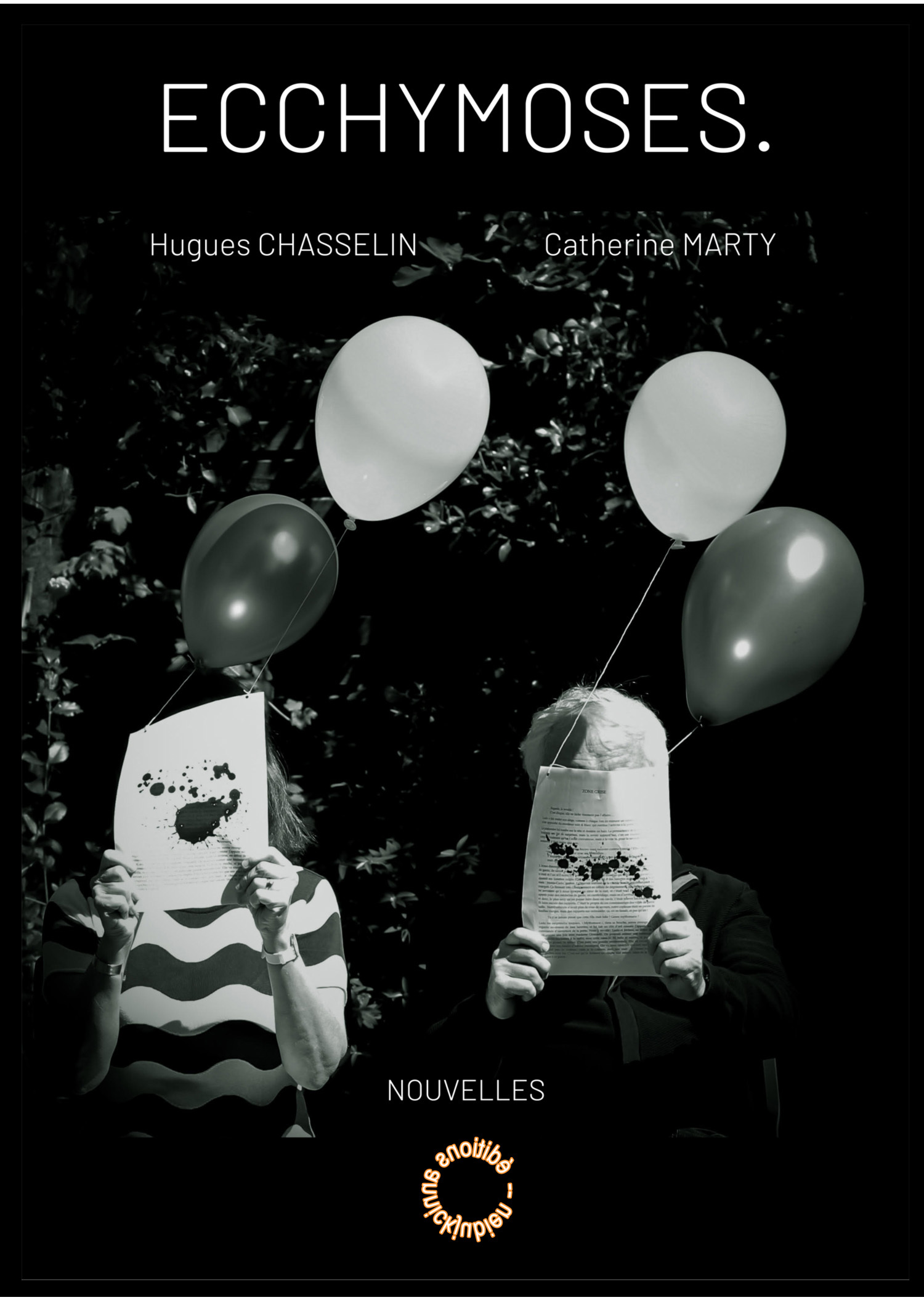 Tout ou presque est là : un mot, un pluriel. Un titre. Et pourtant. Posées là, ces nouvelles sont comme autant d'éclairages crus et rasants. Affleurent alors ces creux, ces bosses, ces parts d’ombres ou lumineuses qui cisèlent les existences. Y deviner des bleus, au corps, à l’âme, que l’infortune inflige à nos vécus. Il y est question d’endroits, d’événements, de voir ou d'oublier, de rester ou partir, et du temps qu'on ne rattrape guère. Ces nouvelles, à quelques exceptions près, vont de pair : elles se croisent, partageant un lieu, un thème, un événement. Elles correspondent, à leur façon. Certaines ont été écrites à quatre mains. Au lecteur de suivre le périple de ces histoires, dans l'ordre ou le plus joli des désordres... Ecchymoses. est un « OLDI » : un Objet Littéraire Désiré Intensément pas ses auteurs, et pour vous, lecteur, un Objet Littéraire Difficilement Identifiable. Aussi. Quant au point posé là, intriguant, dans ce titre, les deux conteurs aiment à croire qu’il est pour eux un point de départ.