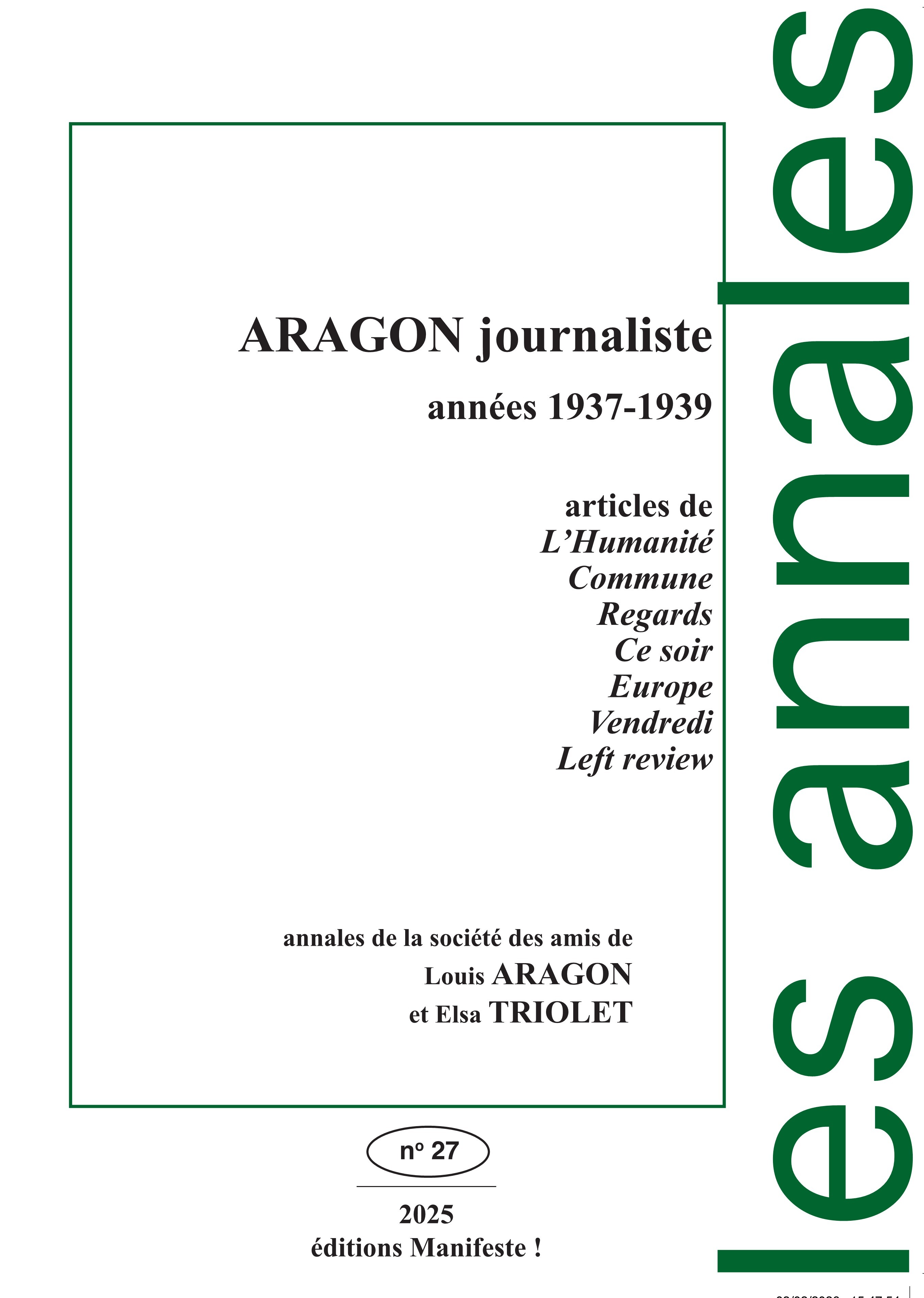 Édition chronologique des articles et textes d’Aragon publiés dans les années1937-1939.Textes et articles de :L’HumanitéCommuneRegardsCe soirEuropeVendrediLeft review