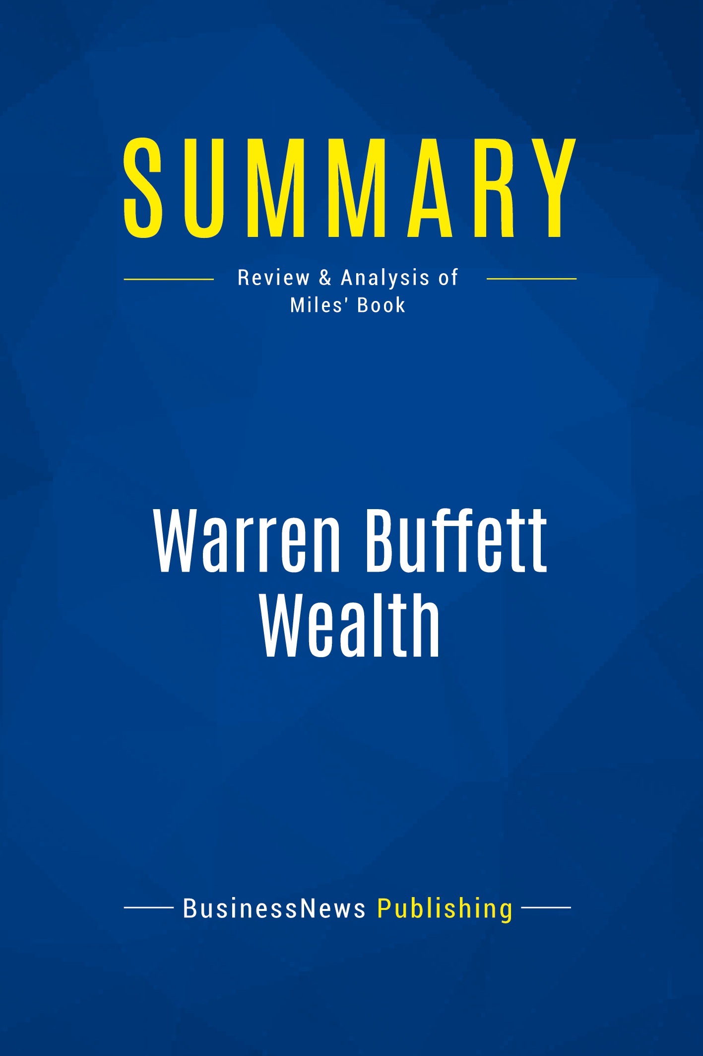 The must-read summary of Robert Miles' book: "Warren Buffett Wealth: Principles and Practical Methods Used by the World's Greatest Investor". This summary of the ideas from Robert Miles' book "Warren Buffett Wealth" shows that the key to creating enormous wealth isn't to constantly try to time the market's peaks and troughs. Instead, to become wealthy, carefully select businesses you'd like to own, invest significant amounts of capital into those companies and then aspire to owning them for a lifetime. This summary provides the principles and practical ideas that you should follow in order to make the right investment. Added-value of this summary: • Save time • Understand key concepts • Expand your knowledge To learn more, read "Warren Buffett Wealth" and discover the key to becoming a better investor.