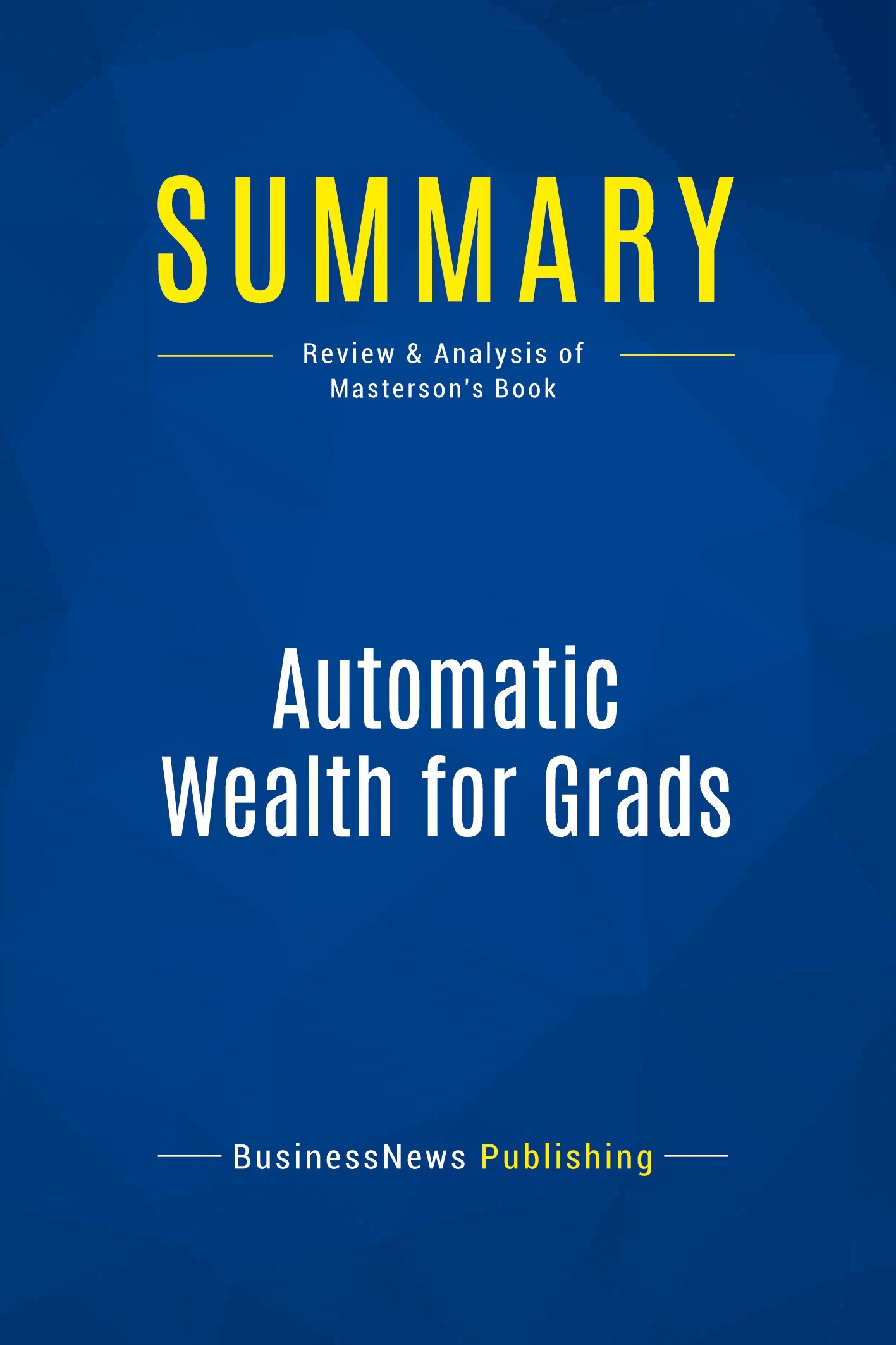 The must-read summary of Michael Masterson's book "Automatic Wealth for Grads... and Anyone Else Just Starting Out". This complete summary of the ideas from Michael Masterson's book "Automatic Wealth for Grads" shows that after finishing university, most students dream of becoming financially independent by finding a good job. Masterson, a highly published author and well-seasoned business entrepreneur, has a substantially more ambitious vision of financial independence than most students even aspire to. He believes that people should earn ten times what they need to live on each year, in order to live off interest generated by investments. After much experience in the matter, Masterson has proposed a fail-safe principle - you should commit to saving 15% of everything you earn and spread it across five important areas which will increase your wealth. This succinct summary includes key quotes from Masterson's book, including one where he defends his focus on 'becoming rich'. He says that it is not the be all and end all of life, but it certainly makes life more enjoyable and can be achieved more easily than you think once you set the wheels in motion. It is simply about learning how to save and invest the right proportion of your income to see long-term rewards! This is a really helpful and practical read for college students or recent graduates. Added-value of this summary: • Save time • Understand the key concepts • Increase your business knowledge To learn more, read "Automatic Wealth for Grads" and start saving and investing for your future.