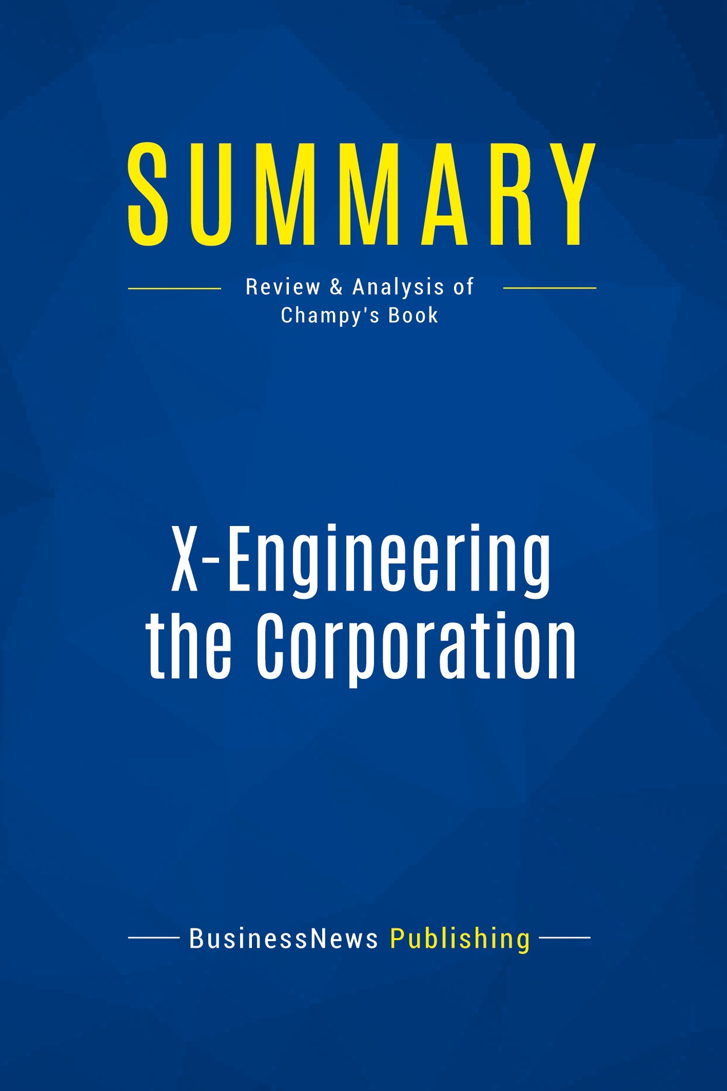 The must-read summary of James Champy's book: "X-Engineering the Corporation: Reinventing Your Business in the Digital Age". This complete summary of the ideas from James Champy's book "X-Engineering the Corporation" shows that the time is right for managers to achieve breakthrough performance by managing across multiple organisations (X-engineering) rather than simply attempting to optimise their own standalone business operations (re-engineering). In his book, the author demonstrates the potential of X-engineering and how it will be the driving force of corporate growth for the next 25 years. This summary is a must-read for anyone wanting to learn more about the concept and how it can help you boost your business' performance. Added-value of this summary: • Save time • Understand key concepts • Expand your knowledge To learn more, read "X-Engineering the Corporation" and discover the key to boosting business performance.