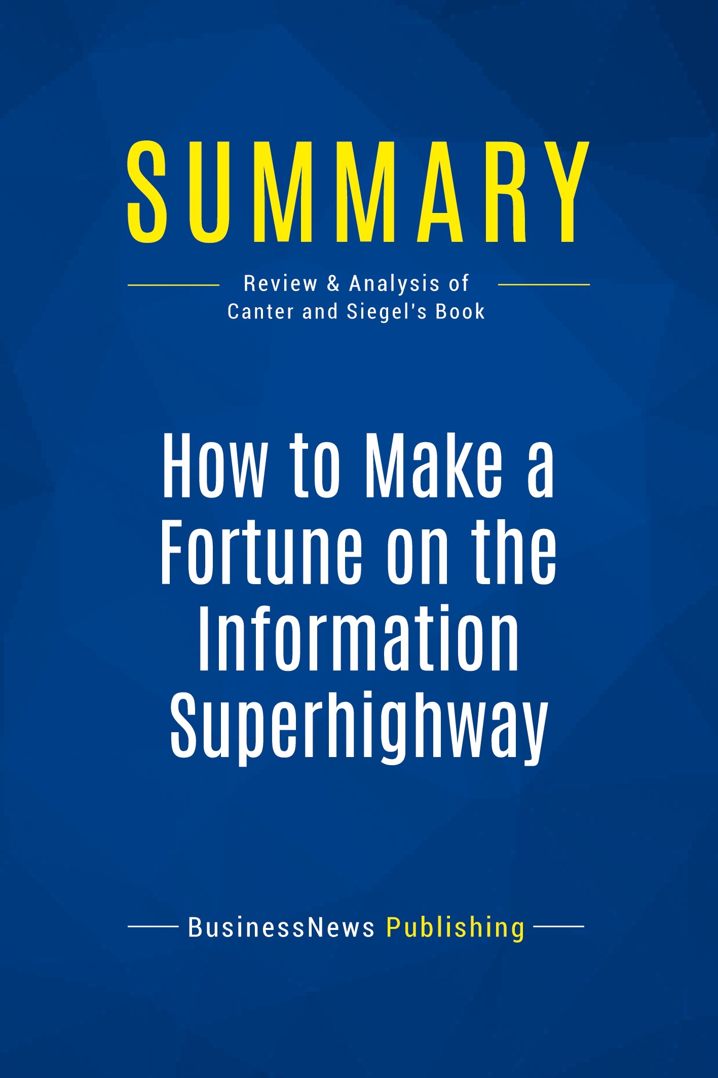 The must-read summary of Laurence Canter and Martha Siegel's book: "How to Make a Fortune on the Information Superhighway: Everyone's Guerrilla Guide to Marketing on the Internet". This complete summary of the ideas from Laurence Canter and Martha Siegel's book "How to Make a Fortune on the Information Superhighway" shows that internet marketing is now essential, as most successful businesses understand that the internet is where people spend time, therefore companies must integrate themselves into the community. However, it's remarkable how some businesses still fall into traps that are easily avoidable. The authors point out that interactive marketing is far more effective online than simply advertising, because companies can set up an efficient feedback loop whereby they not only sell products but improve products at the same time. This summary takes the reader through some very simple techniques - such as the best way to set up a mailing list - for creating multimedia advertising strategies. Added-value of this summary: • Save time • Understand the key concepts • Increase your business knowledge To learn more, read "How to Make a Fortune on the Information Superhighway" and discover the road towards a coherent, profitable online marketing strategy.