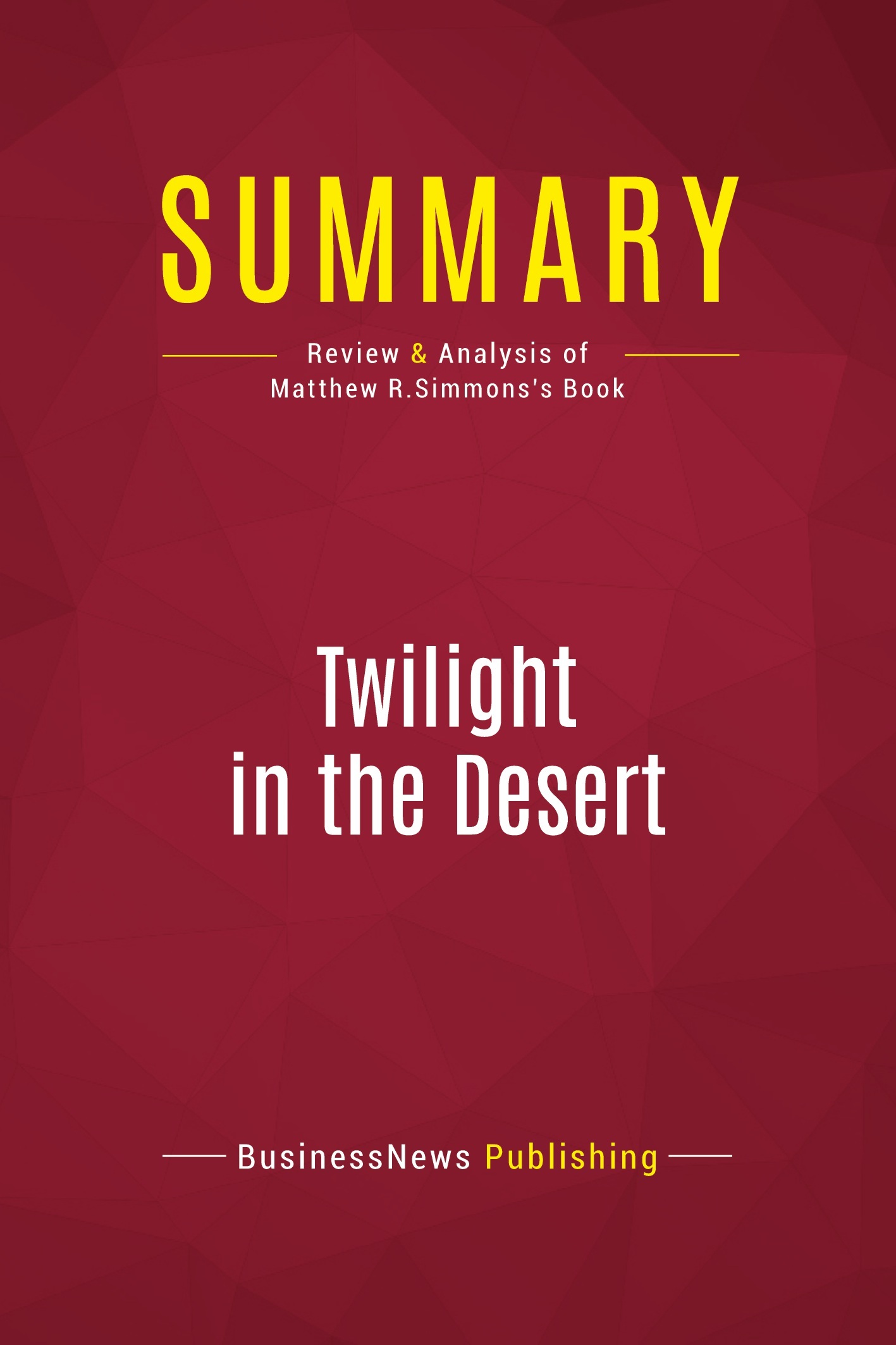 The must-read summary of Matthew R. Simmons's book: "Twilight in the Desert: The Coming Saudi Oil Shock and the World Economy". This complete summary of "Twilight in the Desert" by Matthew R. Simmons, a prominent public figure and name in the oil industry, presents his examination of the demand of oil and reveals that Saudi oil resources have been mismanaged and that this could lead to a catastrophic oil shortage. He lays out what Saudi Arabia and the rest of the world should do to prevent this crisis. Added-value of this summary: • Save time • Understand the threat posed to the oil industry in Saudi Arabia • Expand your knowledge of international politics and industry To learn more, read "Twilight in the Desert" and discover what can be done to save the oil industry from the brink of crisis.