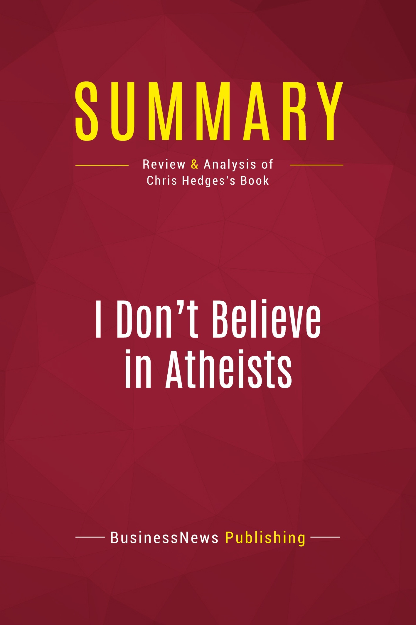 The must-read summary of Chris Hedges's book: "I Don't Believe in Atheists". This complete summary of "I Don't Believe in Atheists" by Chris Hedges, an American activist and minister, outlines the writer's argument that contemporary atheism proposes a dangerous utopian vision. He believes that whether or not religion is right is irrelevant, as it has brought many respectable values to society, and should therefore not be ignored in the struggle to perfect human nature. Added-value of this summary: • Save time • Understand the role of religion in American culture • Expand your knowledge of American politics and society To learn more, read "I Don't Believe in Atheists" and discover how religion should not be overlooked in our society in favour of the values of contemporary atheism.