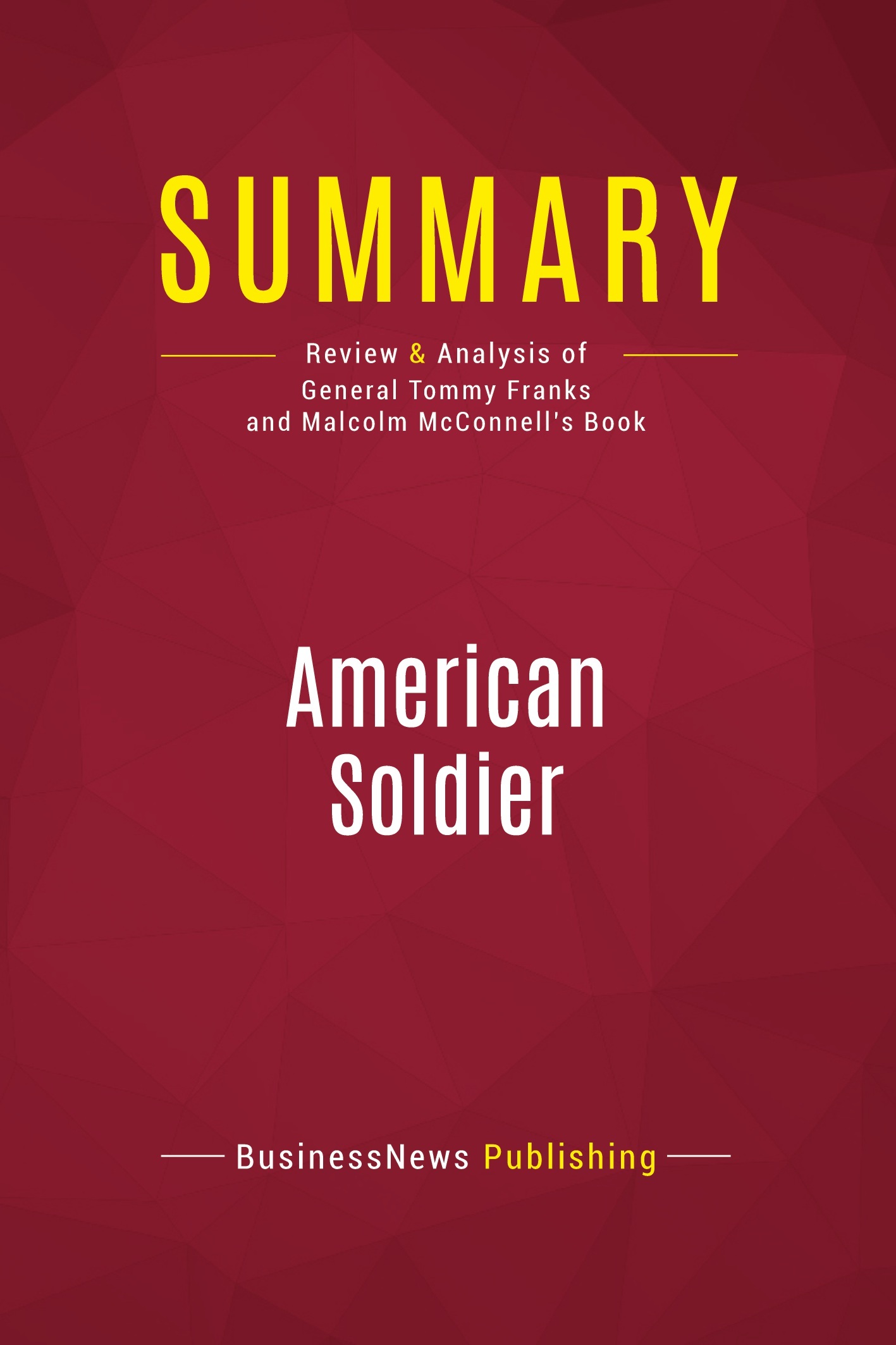 The must-read summary of General Tommy Franks and Malcolm McConnell's book: "American Soldier". This complete summary of "American Soldier" by Franks and McConnell presents a biography that recounts the career of General Tommy Franks. The riveting tale retraces his life from his small-town child to his roles in the Vietnam and Afghan wars, and describes how he led the operations of the war on terror following 9/11 to success using covert diplomacy, double-agents and international collaboration. Added-value of this summary: • Save time • Understand the secrets of American operations during the Afghan war • Expand your knowledge on American military politics and bureaucracy To learn more, read "American Soldier" and discover the compelling story of General Tommy Franks's experiences in the war on terror in Afghanistan.