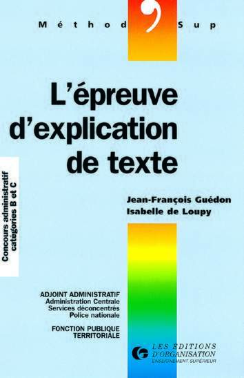 Vous allez vous présenter à un examen à un concours administratif ou à un examen professionnel dans le secteur public ou à tout autre examen ou concours comportant l'étude d'un texte. .Il vous faut vous exercer de façon intensive à l'explication de texte et à la réponse aux questions à partir du texte. Vous trouverez dans ce livre 20 textes de concours récents, tous choisis par des jurys officiels des principaux ministères. Ce livre sera pour vous un atout précieux car : - il vous indique la démarche à suivre à l'aide d'exemples variés et vous accompagne ainsi tout au long de votre cheminement personnel ; - il vous donne l'occasion de vous tester, d'analyser vos erreurs et de vérifier vos acquis grâce à des exercices auto-correctifs qui peuvent être présentés à partir des textes présentés ; - il décortique, explique, traite dans le détail plus de dix grands textes et des sujets variés, en vous donnant des exemples dans de nombreux domaines (depuis les textes littéraires jusqu'aux thèmes d'actualité, en passant par les grands sujets de société ou civilisation. Non seulement cet ouvrage vous dit ce qu'il faut faire, à quels résultats vous devez (et pouvez) arriver, mais il vous montre comment y parvenir. Indispensable pour la préparation aux épreuves des examens et concours, ce livre vous sera très utile pour votre future vie professionnelle dans une administration ou une entreprise où il faut savoir aller à l'essentiel d'un texte, rédiger des notes précises, exprimer et développer vos idées.. Jean-François GUEDON est ancien élève de l'ENA. Il participe à de nombreuses actions de formation et préside fréquemment des jurys de concours. Il a déjà collaboré à de nombreux ouvrages sur les techniques d'expression et la préparation aux examens et concours. Il dirige aux Editions d'Organisation la collection Les Indispensables de la culture générale. Isabelle de LOUPY, professeur agrégé de Lettres classiques, participe à des jurys universitaires et dirige de nombreux stages et séminaires. La collection Méthod'Sup a pour objectif de vous aider à acquerir les méthodes de travail vous permettant de préparer intelligemment contrôles, examens et concours.Cet acquis méthodologiquesera un atout précieux pour votre future activité professionnelle.