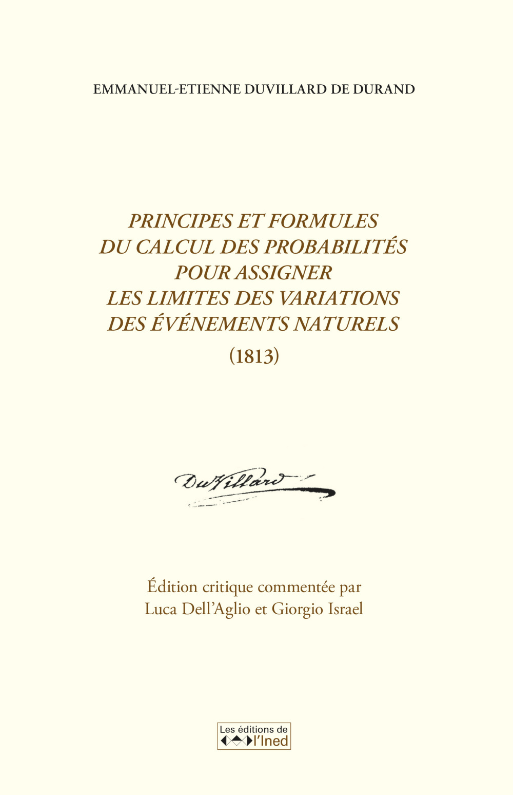 Emmanuel-Étienne Duvillard de Durand (1755-1832), connu pour ses activités d'actuaire et l'élaboration de tables de mortalité , a été longtemps ignoré pour sa contribution à l'analyse de la mathématique sociale et en particulier à la modélisation mathématique de la mortalité. Ses tentatives pour entrer à la prestigieuse Académie des sciences et sa volonté de donner à la statistique des populations une dimension probabiliste, confirment que nous sommes en présence, non seulement d'un grand mathématicien, mais d'un véritable savant au sens le plus noble du terme, auquel cet ouvrage tente de rendre hommage. Cet ouvrage constitue en effet une synthèse de ses travaux, appréciée à l'époque par ses pairs, Lagrange, Legendre et Laplace, mais que les vicissitudes de l'histoire ont fait tomber dans l'oubli. Cet écrit, demeuré totalement inédit (l'ouvrage présenté ici en est la première transcription et édition), fut rédigé en 1813. Il traite de la mortalité, dans la lignée des travaux du mathématicien Jean-Henri Lambert, publiés en 1772. Duvillard entreprend de construire une équation qui décrirait au mieux l'extinction progressive d'une génération humaine. Ses travaux représentent donc un tournant dans l'étude des phénomènes démographiques et une première tentative d'application des principes du calcul des probabilités à la science des populations. Nous sommes en présence d'un véritable texte fondateur sur l'évaluation précise des limites à assigner à l'estimation du nombre d'une population. Rendons hommage aux éditeurs de ce traité, Giorgio Israel et Luca Dell'Aglio , véritables découvreurs de ces archives inédites, qui ont patiemment défriché, décortiqué, transcrit ce texte manuscrit, accomplissant un véritable travail de mémoire avec une volonté affichée de rendre justice à ce personnage hors normes pour lui redonner une place pleine et entière dans l'histoire des sciences. Giorgio Israel est spécialiste de l'histoire des sciences, membre de l'Académie internationale d'histoire des sciences, du comité exécutif de la Commission internationale d'Histoire des Mathématiques et directeur du centre de Recherche en méthodologie des Sciences à l'université de Rome La Sapienza. Luca Dell'Aglio est historien des sciences et enseigne notamment au département de Mathématiques de l'université de Calabre. Lire le focus sur : Duvillard, une importante contribution à la mathématique sociale… (http://www.ined.fr/fr/tout-savoir-population/memos-demo/focus/duvillard/ target=)