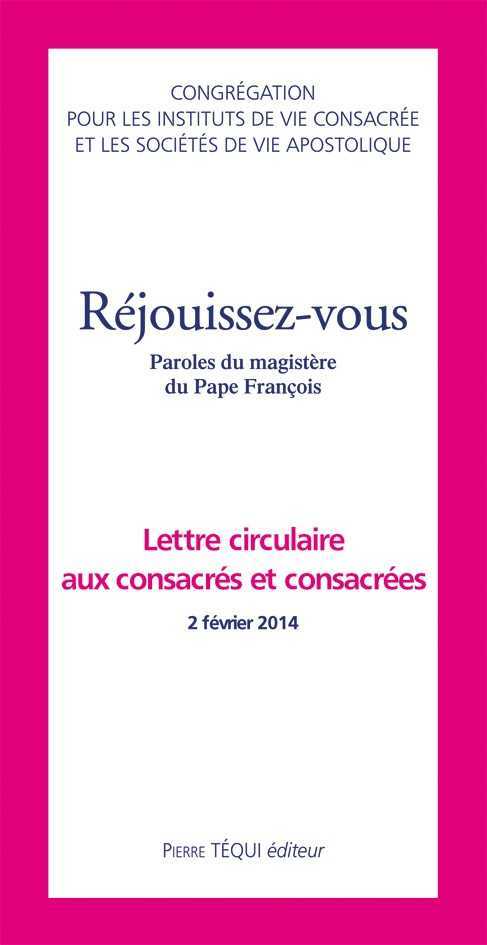 Réjouissez-vous est le titre de la lettre que la Congrégation pour les Instituts de Vie Consacrée et les Sociétés de vie apostolique a adressée aux religieux et religieuses pour 2015, année dédiée à la vie consacrée qui s'ouvre le 30 novembre 2014 (premier dimanche de l'Avent) et se terminera le 2 février 2016, pour inclure cette date qui est celle de la Journée de la Vie consacrée. La Congrégation pour les Instituts de vie consacrée et les Sociétés de vie apostolique propose de réfléchir sur le temps de grâce qu'il nous est donné de vivre, cette invitation spéciale que le pape adresse à la vie consacrée. « Je voulais vous dire un mot, et ce mot, c'est la joie. Partout où il y a les consacrés, il y a toujours de la joie ! » Pape FRANÇOIS. Le Cardinal Braz de Aviz a déclaré : Le sens de ce titre est merveilleux parce que notre vie doit exprimer une grande joie ; une consacrée ou un consacré triste, il vaut mieux qu'il n'existe pas. Notre visage doit changer, nous devons trouver la source de cette joie pas seulement à l'extérieur de nous mais à l'intérieur. Dans la lettre ont été introduits des textes de l'Écriture Sainte mais, surtout, les paroles du Saint-Père. La dernière partie sert à la réflexion avec quelques questions du Pape François qui peuvent aider à approfondir. L' Ave Maria de la joie est la prière de clôture.